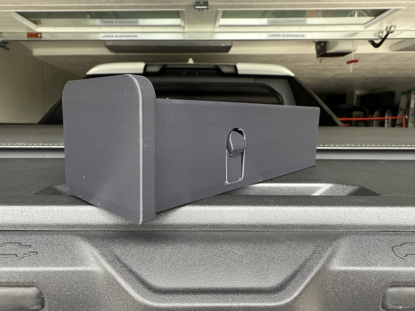 Hộp lưu trữ kín đáo lắp trong hitch receiver, vừa dưới nắp che hitch OEM cho Silverado EV và Sierra EV. Có ngàm kẹp giữ chắc, nắp trượt không rơi. File STL miễn phí; khuyến nghị in ASA/PETG, 3 walls.