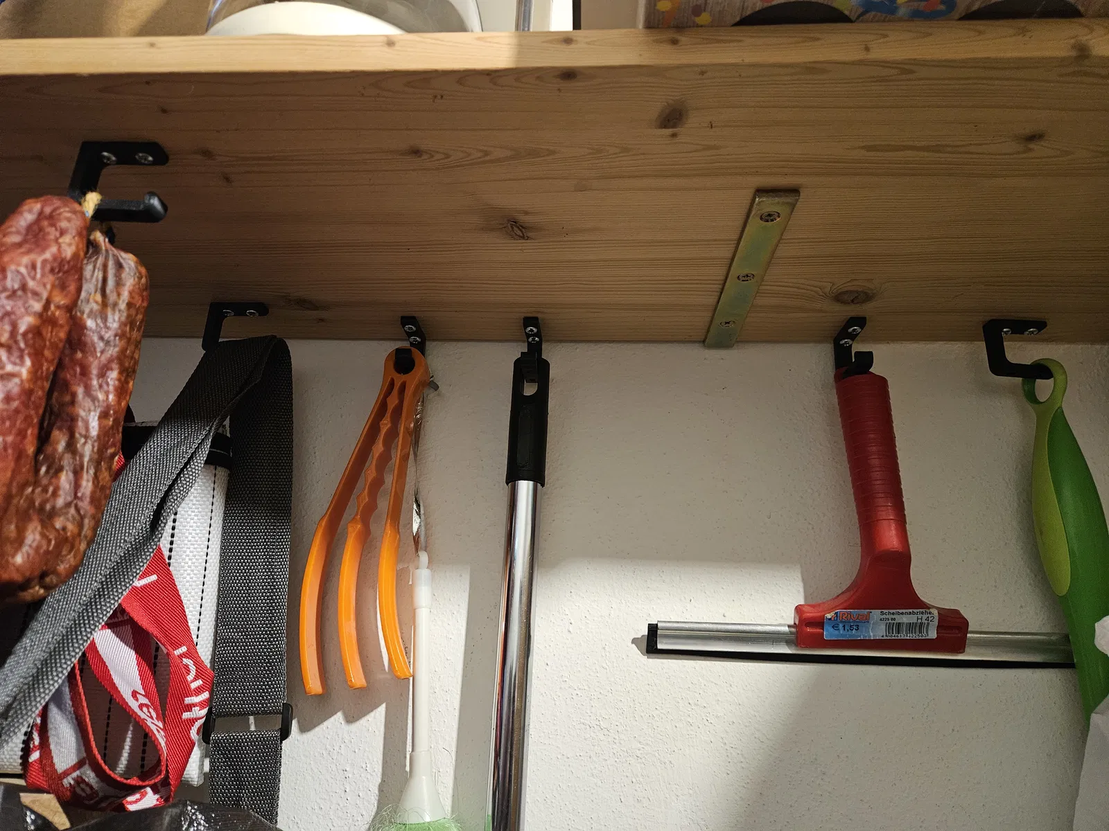 Móc treo ngang dùng cho chổi, xúc xích, v.v. In bằng ASA, PETG và PLA; nên in với 4 vòng tường (wall loops) hoặc 100% infill.