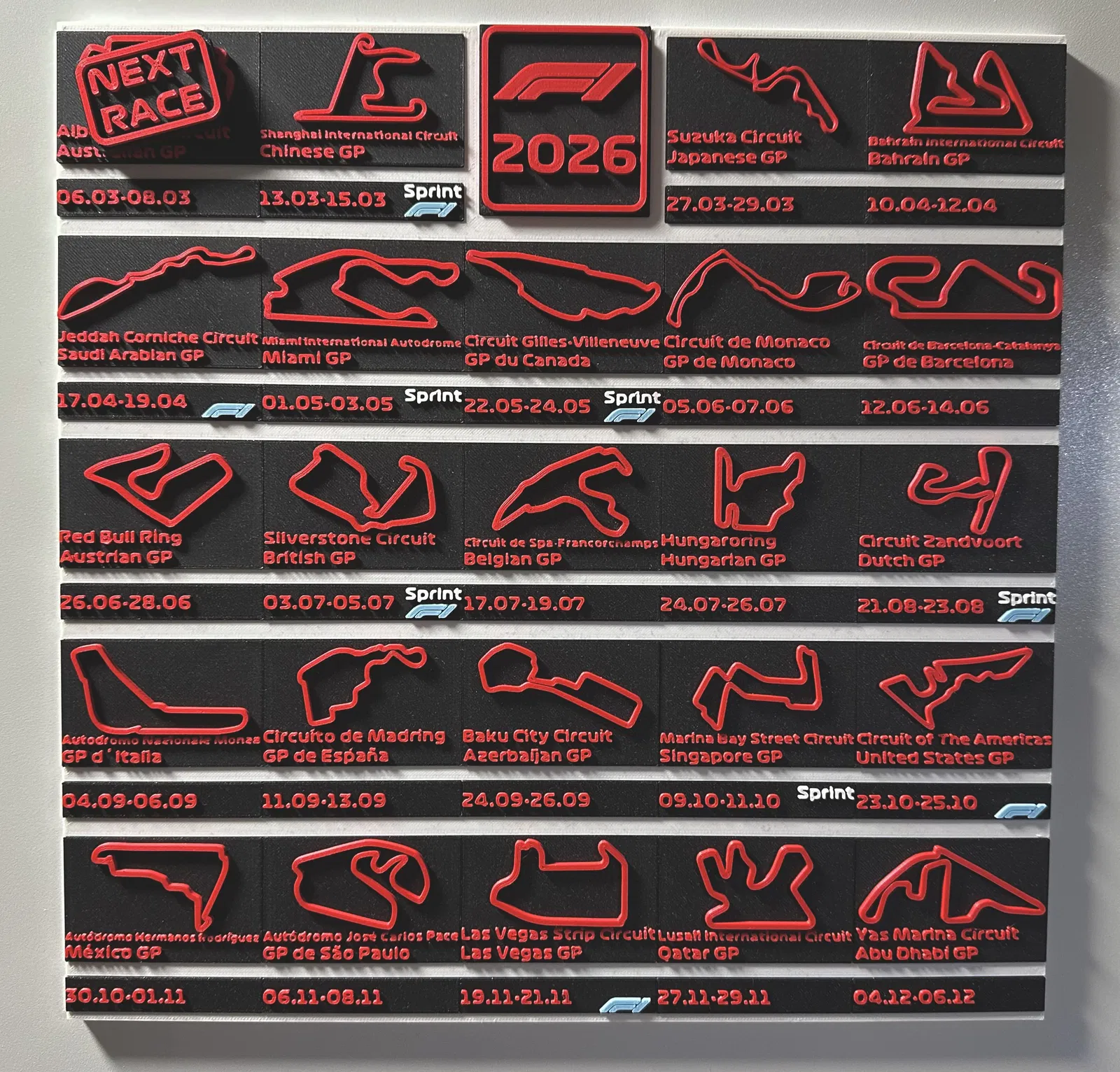 Mình thiết kế bộ lịch F1 dạng modular này với đầy đủ các chặng đua (Circuits) và ngày tháng. Tất cả Circuits và Dates đều nằm trên các slider nên sang năm bạn có thể đổi vị trí rất dễ, rồi chỉ cần in các Date mới. Ngoài ra còn có ký hiệu cho các Sprint Weekend và các chặng đua F1 Acadamy (logo F1 màu xanh). Phần Next Race Batch có nam châm nên có thể đẩy lên phía trước ở từng Circuit.
