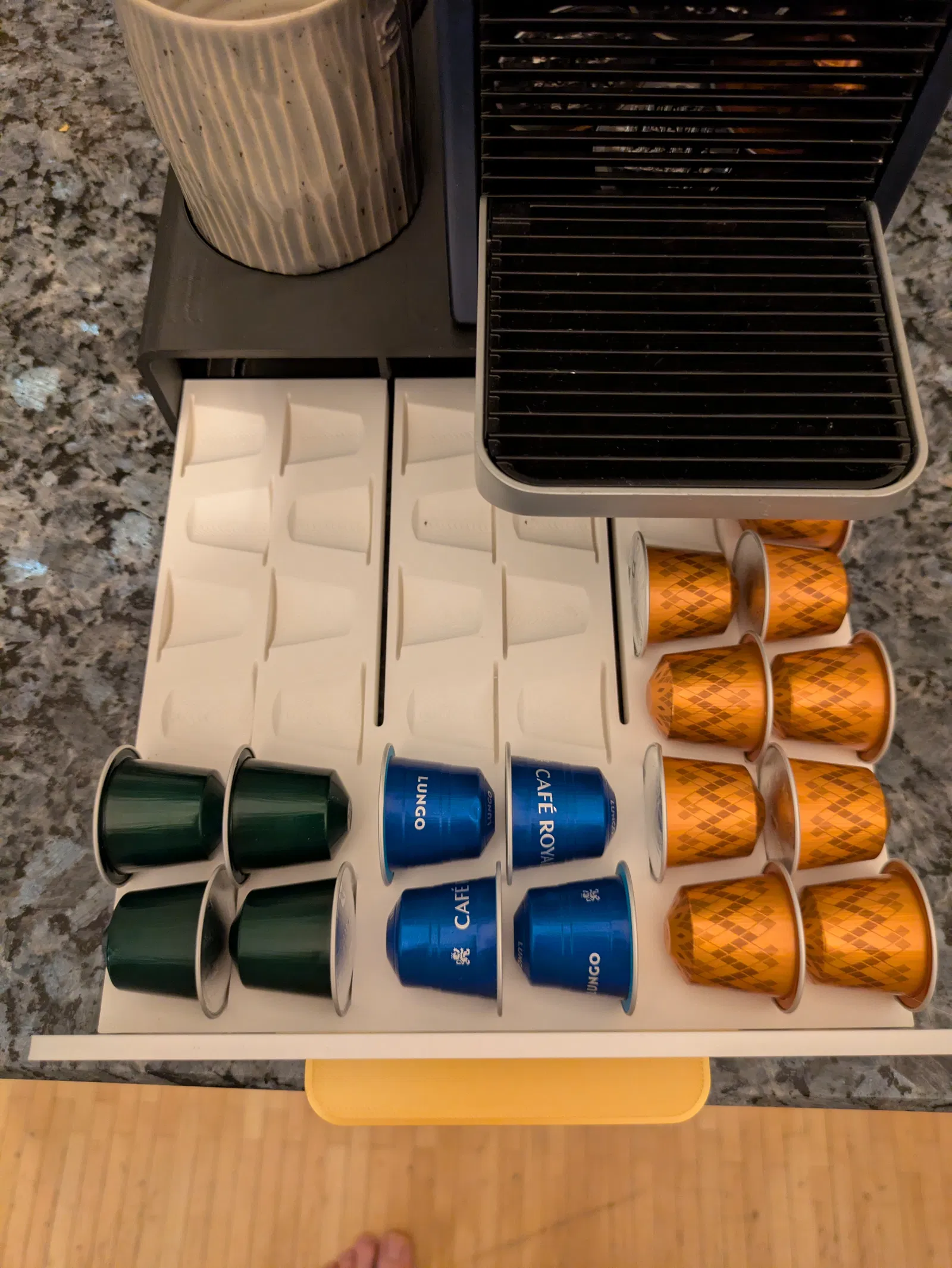 Mình muốn có chỗ để cất capsule Nespresso, đồng thời cũng cần gọn gàng để tiết kiệm diện tích. Kết quả là ngăn kéo đựng capsule Nespresso này. Để tiết kiệm chỗ, capsule được đặt nằm ngang (pressfit) theo lưới 6x6 (chứa 36 capsule) và thiết kế tập trung vào độ ổn định. Hình minh hoạ là máy Nespresso PIXIE của mình đặt ở trên.
