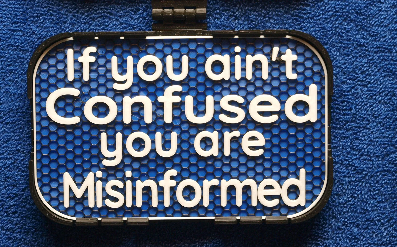 Bảng 100x160mm, với dòng chữ: "If you ain't Confused, you are Misinformed"