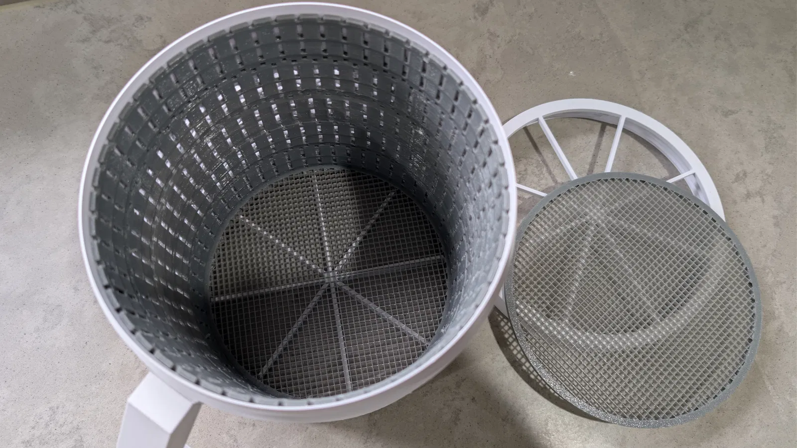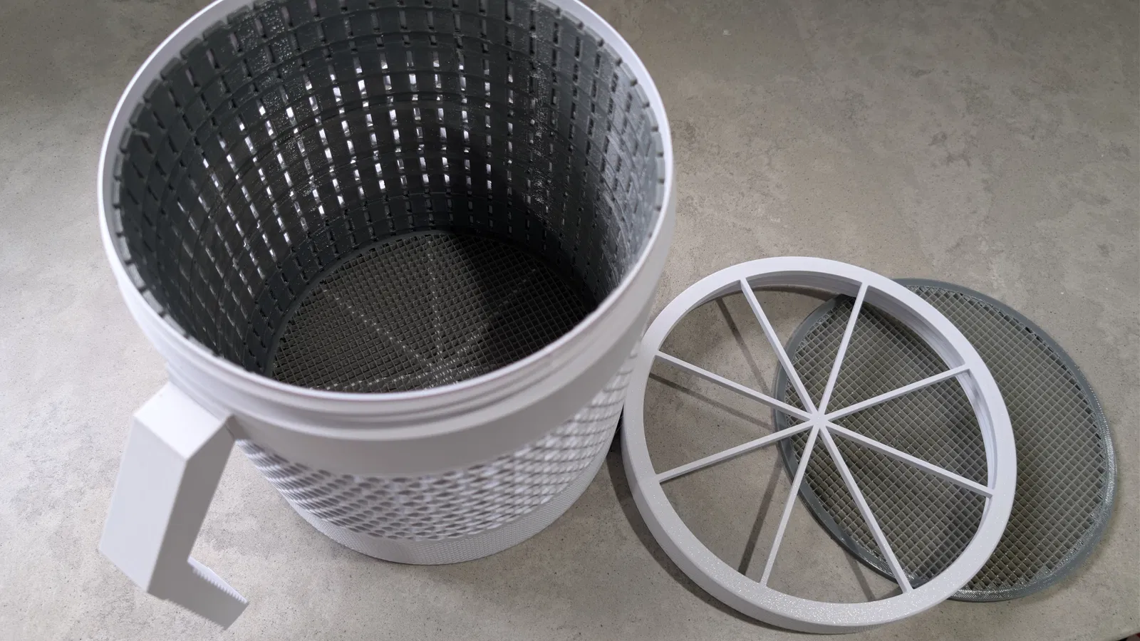 Đây là một cái “bucket” gần như hở ở cả hai đầu, có nắp ren vặn vào, và các miếng TPU lót kín toàn bộ phần bên trong. Có thể ngâm cả bộ vào thau rồi xả lại bằng nước áp lực cao hơn. Kích thước ngoài 20x20cm, kích thước trong sau khi lót khoảng đường kính 178mm x cao 190mm.
