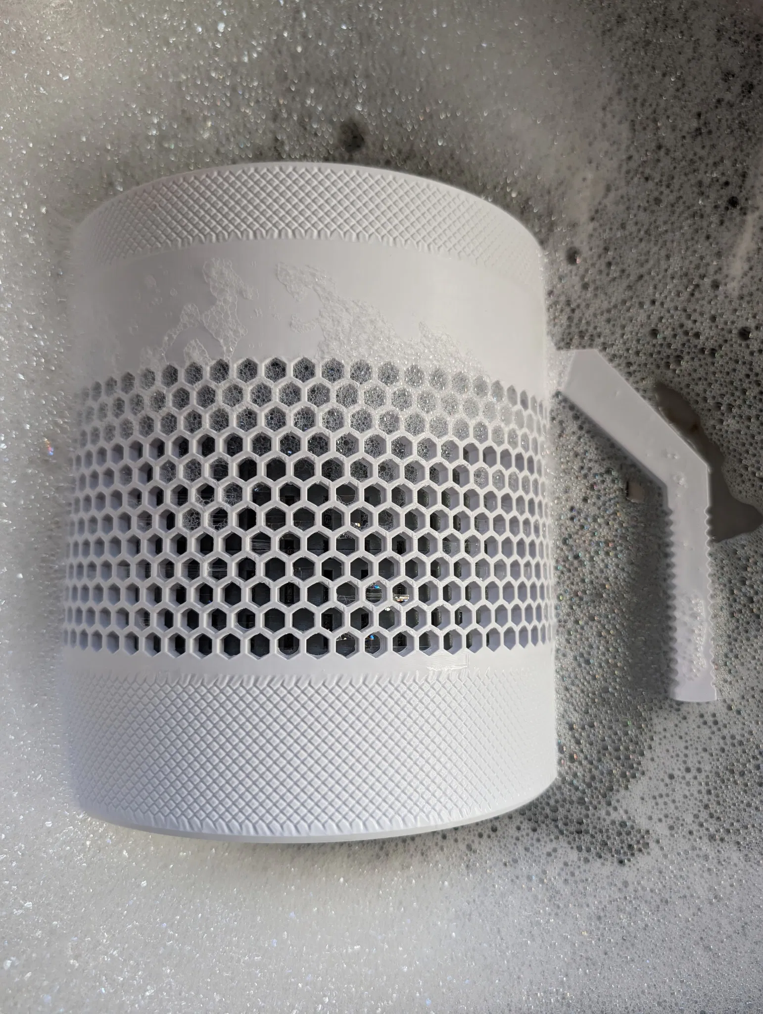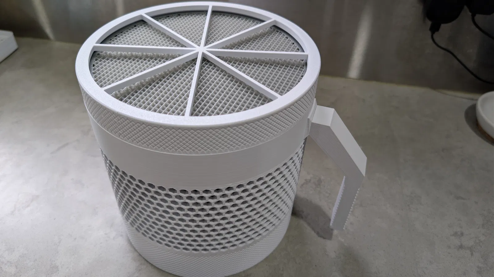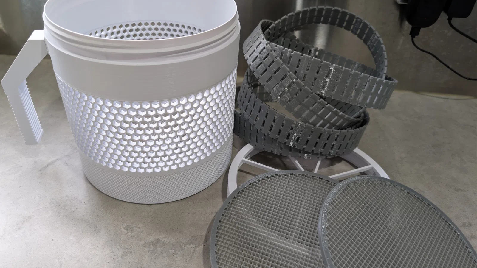 Mình in phần thân, nắp và tay cầm trong các hình bằng eSun cold white PLA, còn các miếng lót in bằng eSun grey 98A TPU.