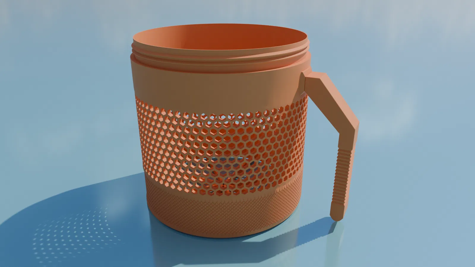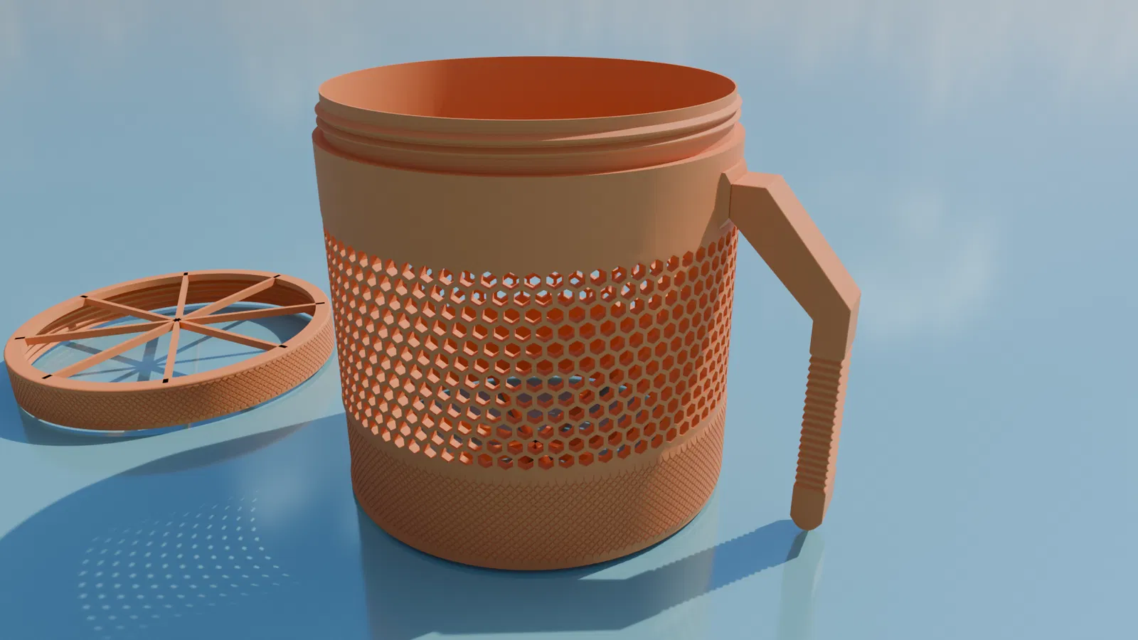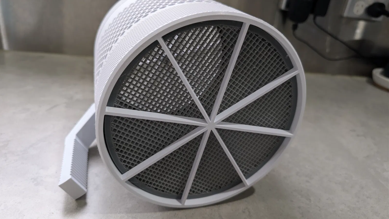Mình in phần thân, nắp và tay cầm trong các hình bằng eSun cold white PLA, còn các miếng lót in bằng eSun grey 98A TPU.