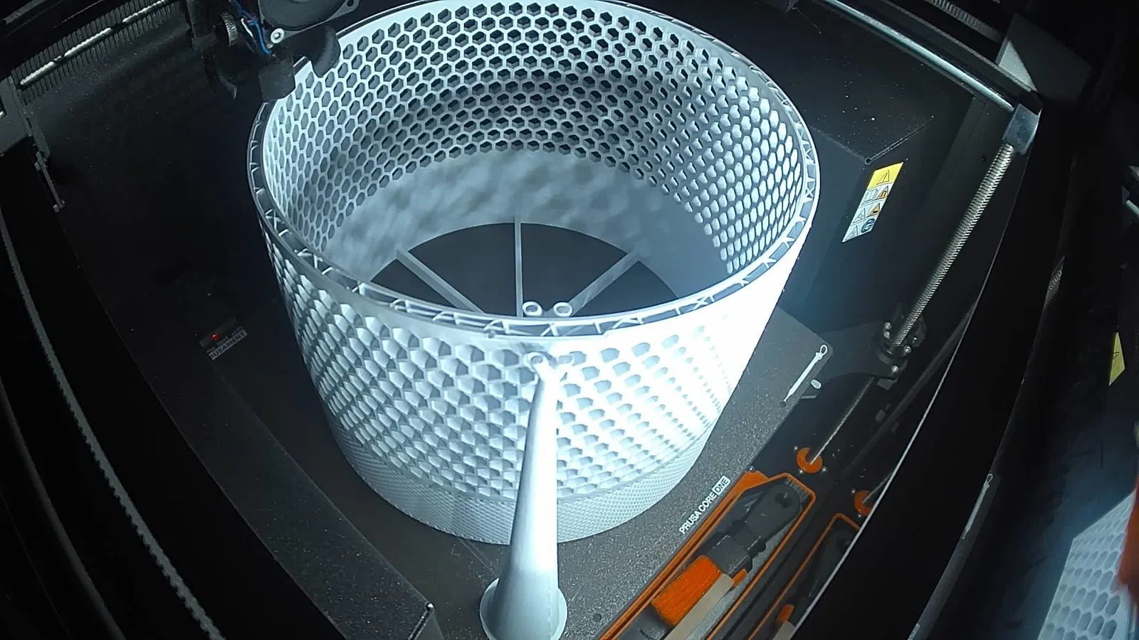 Mình dùng organic supports với enforcers tô vào các lỗ bắt vít M3 trên thân chính và tay cầm. Phần còn lại, gồm cả honeycomb grille, in ổn không cần supports. Thân chính được xoay để chừa chỗ cho organic supports bằng cách xoay sao cho các lỗ vít hướng về một góc của build plate (xem hình tiến độ ở trên).