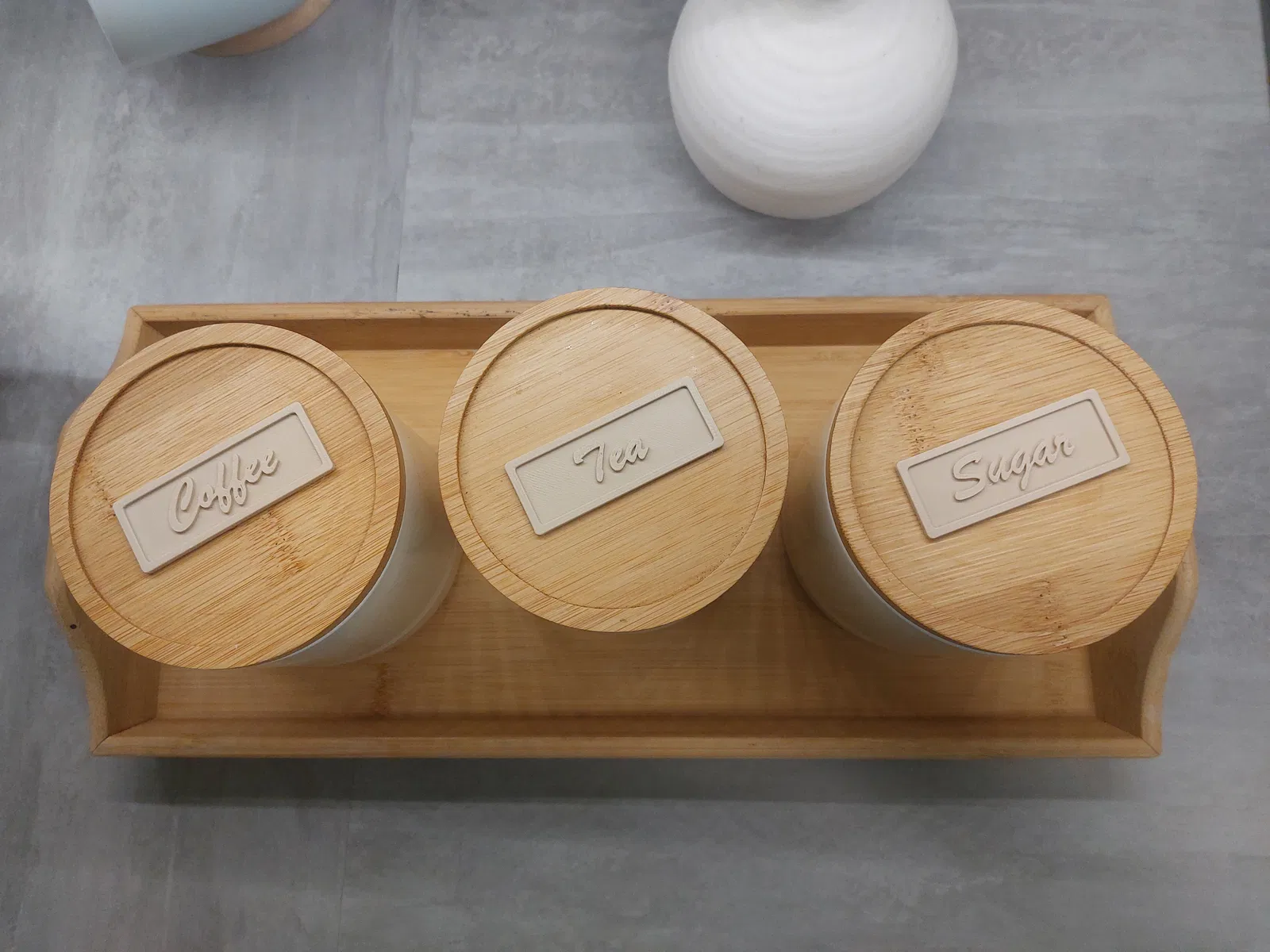 Bộ nhãn hũ “Coffee, Tea, Sugar” (kèm nhãn Flour) in nhanh, dễ gắn bằng keo nến. Có thể uốn theo bề mặt cong bằng cách hơ nhẹ bằng máy sấy/heat gun. Kích thước 65×25×2.5mm, khuyến nghị in phẳng, không cần supports.