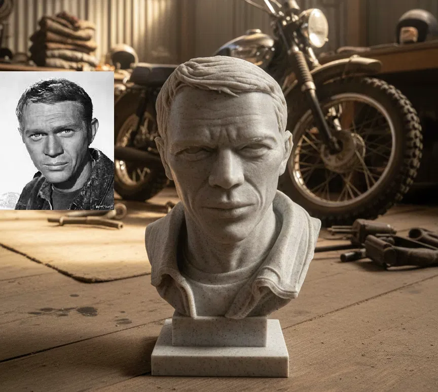Mẫu Terrence Steve McQueen - tượng bán thân in 3D, tái hiện gương mặt và thần thái “The King of Cool” theo bức ảnh nổi tiếng nhất của ông. Phù hợp trưng bày cho fan điện ảnh và sưu tầm tượng.