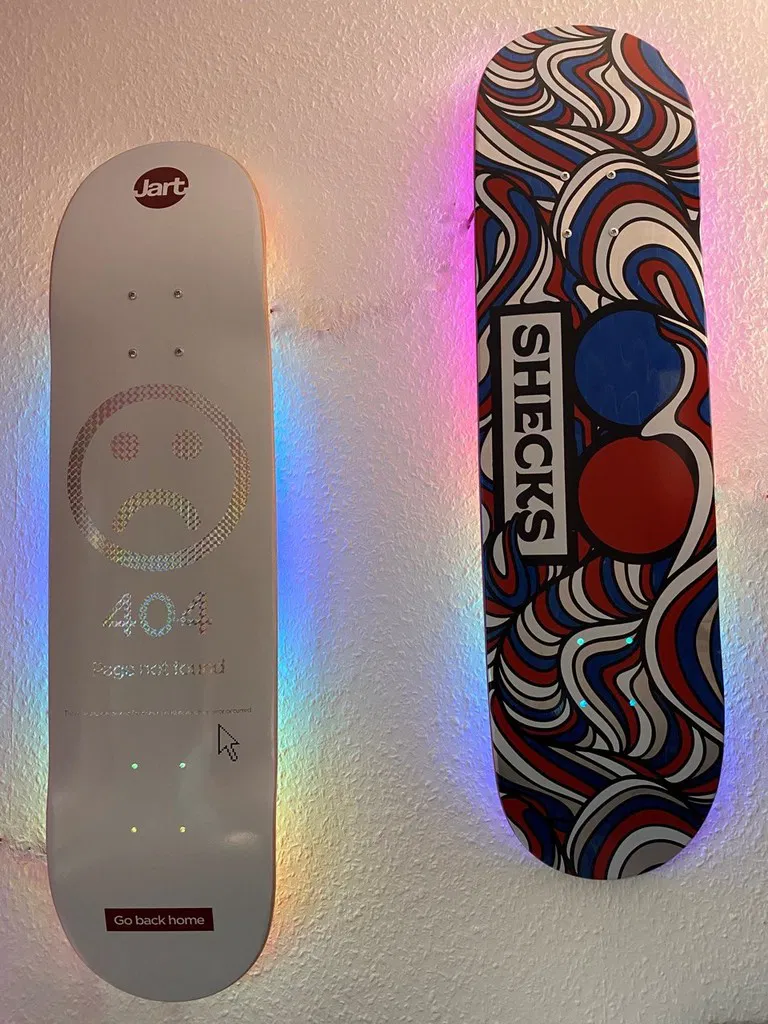 Bracket treo deck skateboard lên tường để trang trí. Có 2 lỗ chốt (dowel) để cố định vào tường và 4 lỗ để bắt deck. Phía trên có khe gắn LED strips, thiết kế in không cần supports trong slicer.