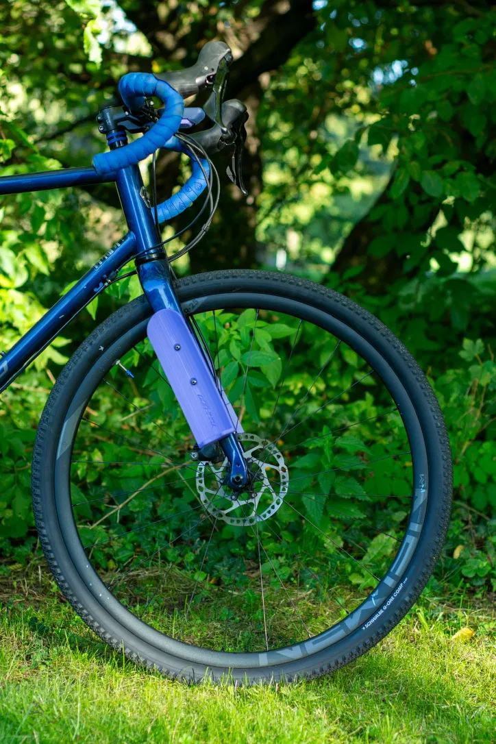 Holder gắn lên phuộc để buộc tarp hoặc nệm cuộn khi đi bikepacking. Dùng 2 straps để cố định đồ, thao tác dễ. Khuyến nghị in PETG khoảng 40% infill (có thể giảm).