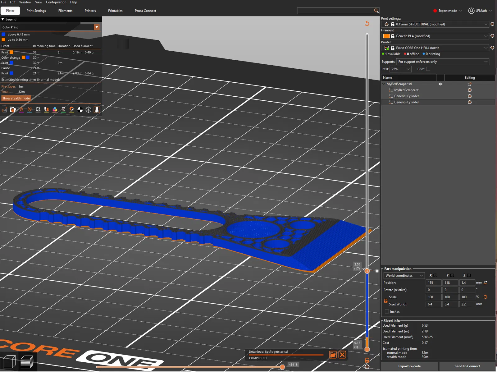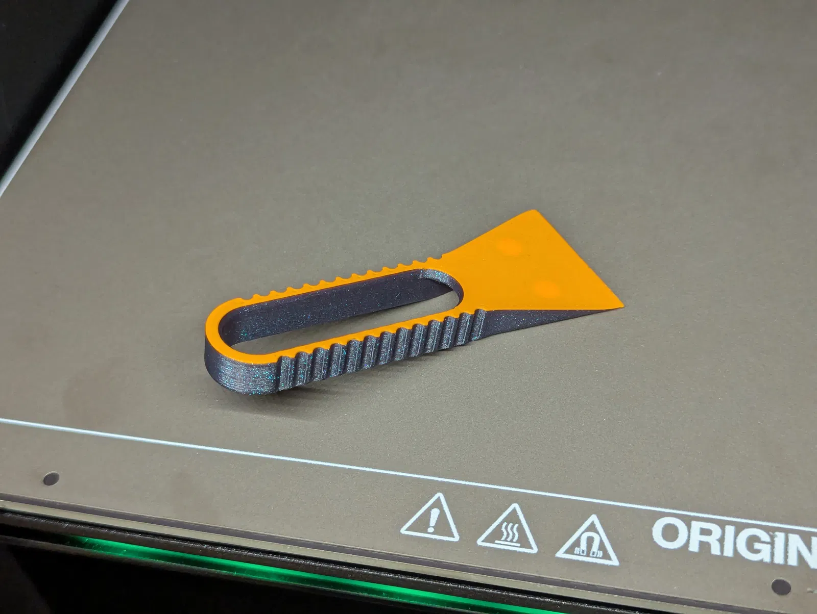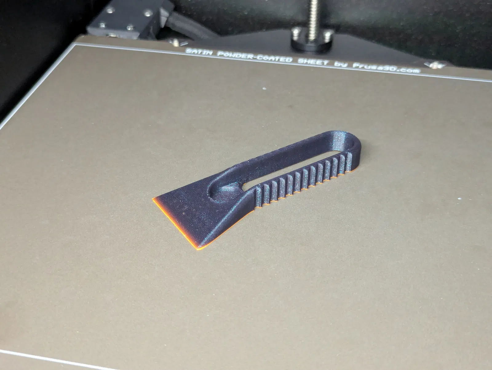 Một mẫu scrapper in 3D “cũng như bao cái khác” nhưng là do mình làm. In dễ, có thể thêm lỗ gắn nam châm và pause trong slicer để gắn tiện lên Core One. Có kèm file CAD.