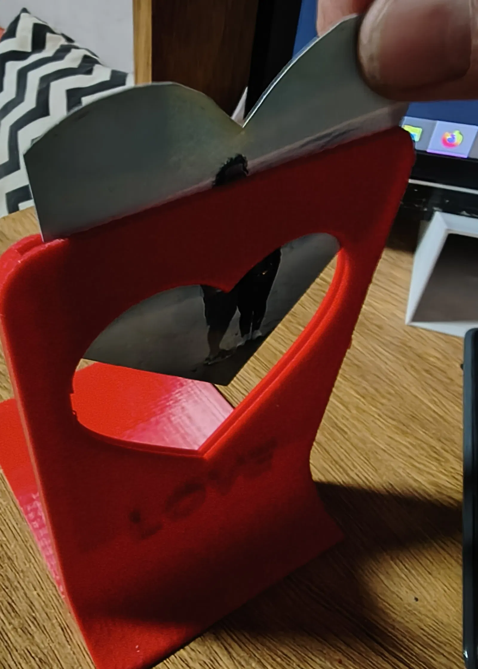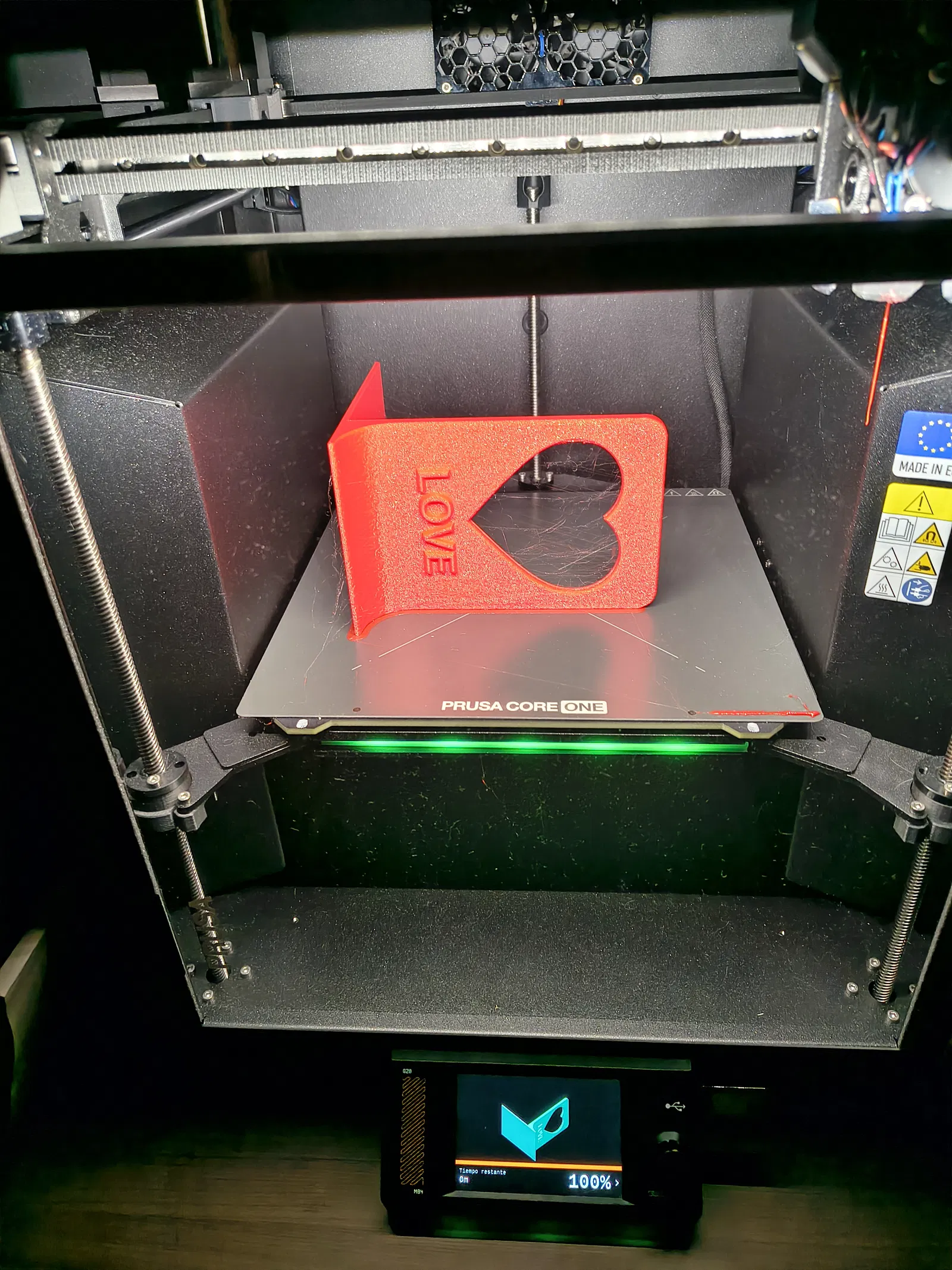 Mẫu chặn sách hình trái tim kiêm khung ảnh màu đỏ, có chữ LOVE, trang trí đẹp và rất hợp làm quà Valentine. Gợi ý in đặt ngang để chắc hơn, không cần supports; có thể thêm bề mặt nhám (0.2/0.1).