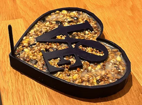 Máng ăn chim thiết kế trái tim với chữ LOVE kinh điển kiểu Robert Indiana. In bằng filament chống chịu thời tiết, đổ hạt và phủ mỡ để kết dính; treo lên tường, hết thì châm thêm là xong.
