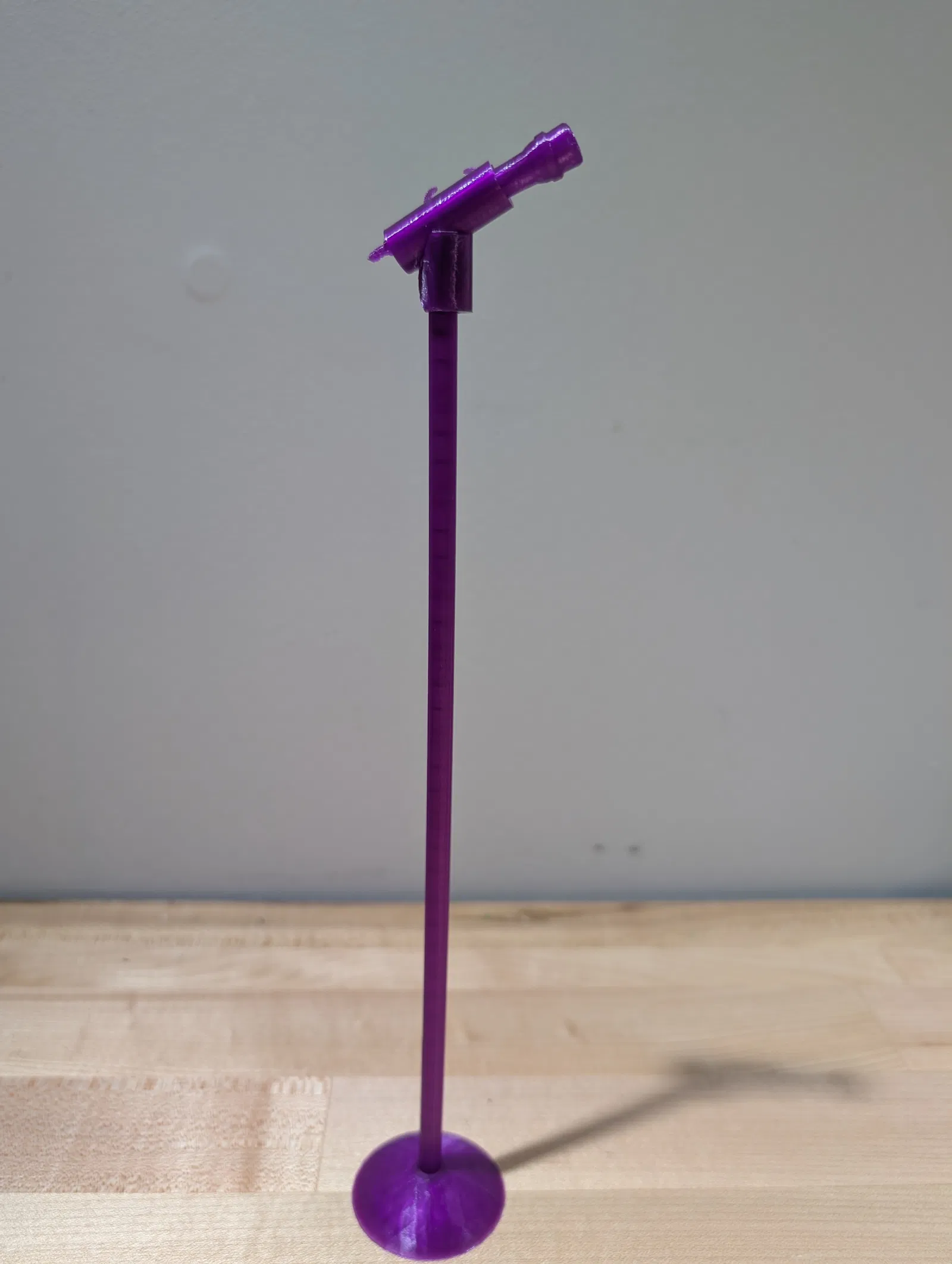 Remix micro Barbie và thêm chân đế micro đơn giản cho búp bê Mattel Kpop Demon Hunters. In PLA với supports/brim; khuyến nghị organic supports cho mic và ngàm. Có thể cần scale vì figure cao hơn Barbie thường.