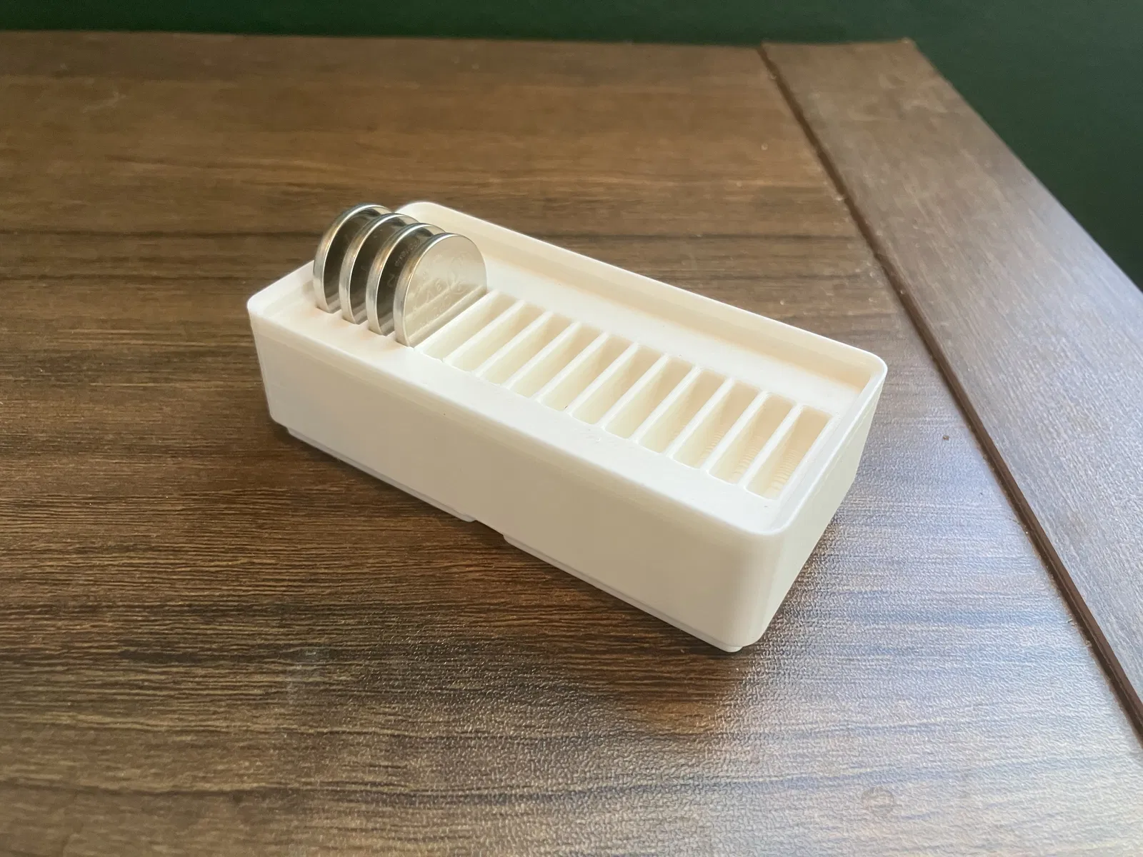 Khay giữ pin CR2032 theo chuẩn Gridfinity kích thước 1U x 2U x 3U, chứa được 15 viên. Pin được đặt nông hơn nửa khe để dễ lấy ra. Có lip nhưng không có lỗ nam châm, không thiết kế để stack.