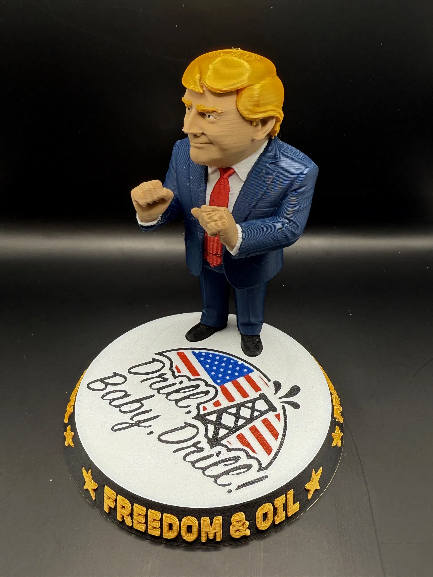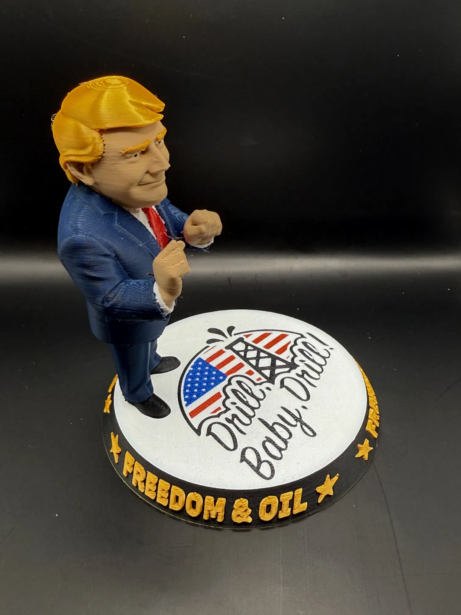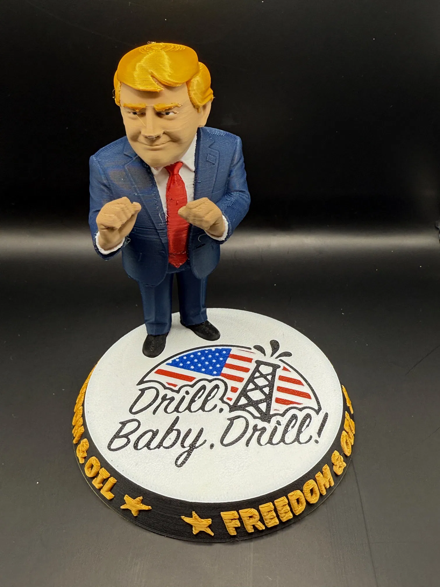 Mẫu “Drill Baby Drill” là tượng Donald Trump thể hiện tình yêu với hoạt động thăm dò dầu khí. Hướng dẫn kèm theo gồm danh sách filament, thiết lập AMS, các điểm Pause đổi màu, thông số layer và Support cho Donald và phần đế.