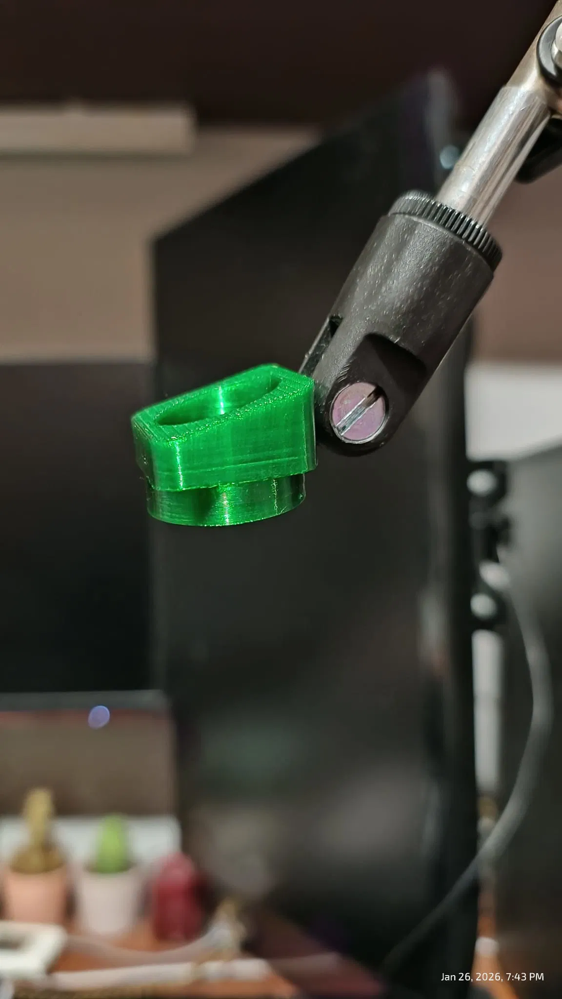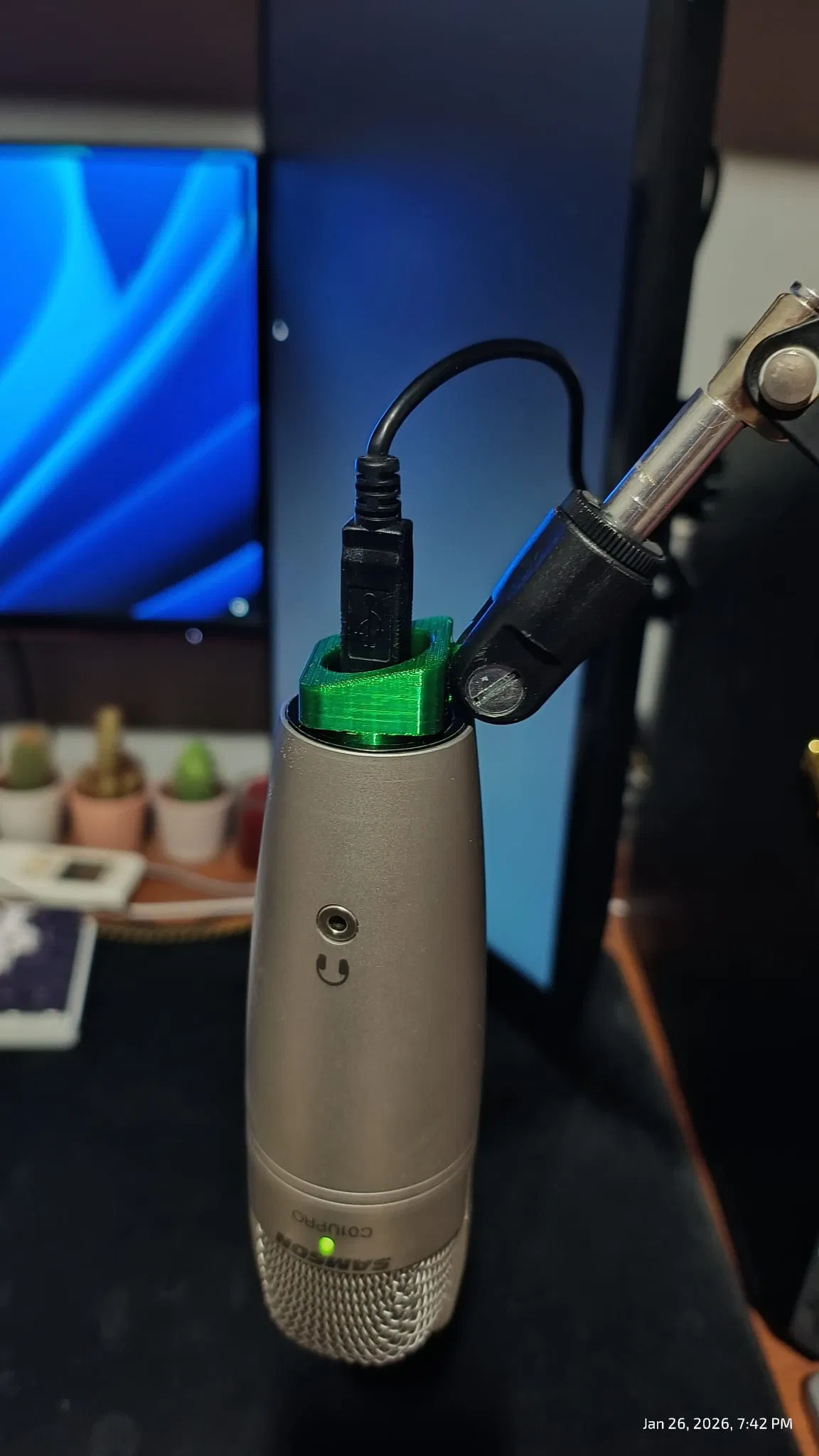 Ngàm/Bracket gắn arm stand cho micro Samson C01UPRO. In bằng PETG. Cần phần cứng: 1 bolt M6 dài 25mm và 1 nut M6. Vặn ngàm vào ren dưới micro rồi siết chặt bằng bolt + nut.