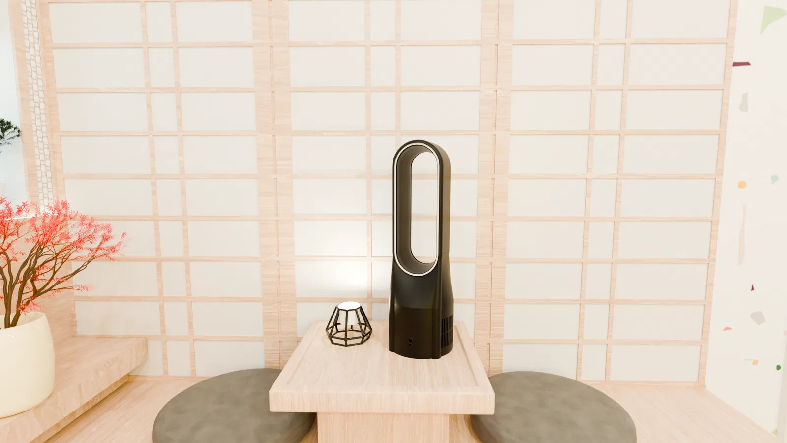 Quạt không cánh hoạt động thật, có hiệu ứng luồng gió rõ ràng.