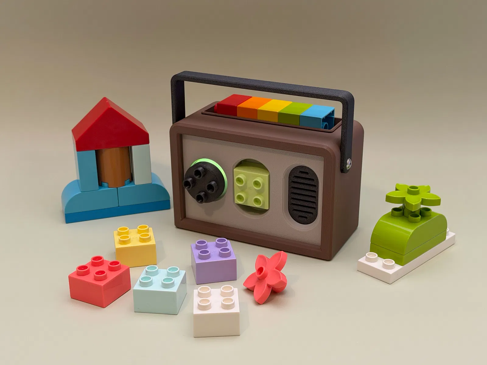 Máy MP3 in 3D dùng CircuitPython và RP2040 PropMaker Feather, nhận diện màu của gạch LEGO DUPLO bằng cảm biến màu để phát bài hát/hiệu ứng khác nhau. Hỗ trợ microSD qua Adalogger FeatherWing để lưu nhiều file MP3.