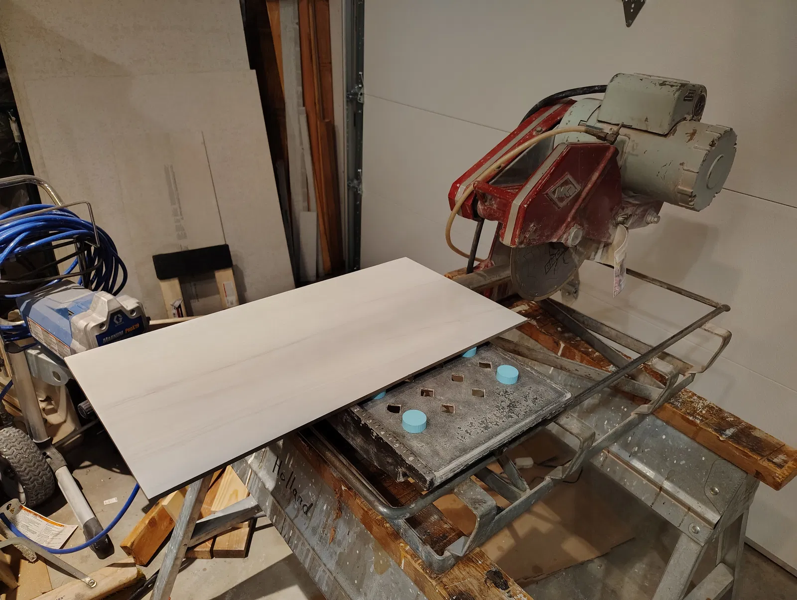 Máy cắt gạch MK Diamond 101 của mình được thiết kế cho loại gạch nhỏ hơn so với gạch phổ biến hiện nay. Những miếng support này gài vào các lỗ trên bàn trượt và nâng mặt làm việc lên ngang với back fence để bạn có thể xử lý gạch khổ lớn (trong hình là 12x24) đang rất hay dùng bây giờ. Cách “đúng bài” thì là mua máy cắt lớn hơn, nhưng không phải lúc nào cũng làm được, nên mới cần mấy cái support này.