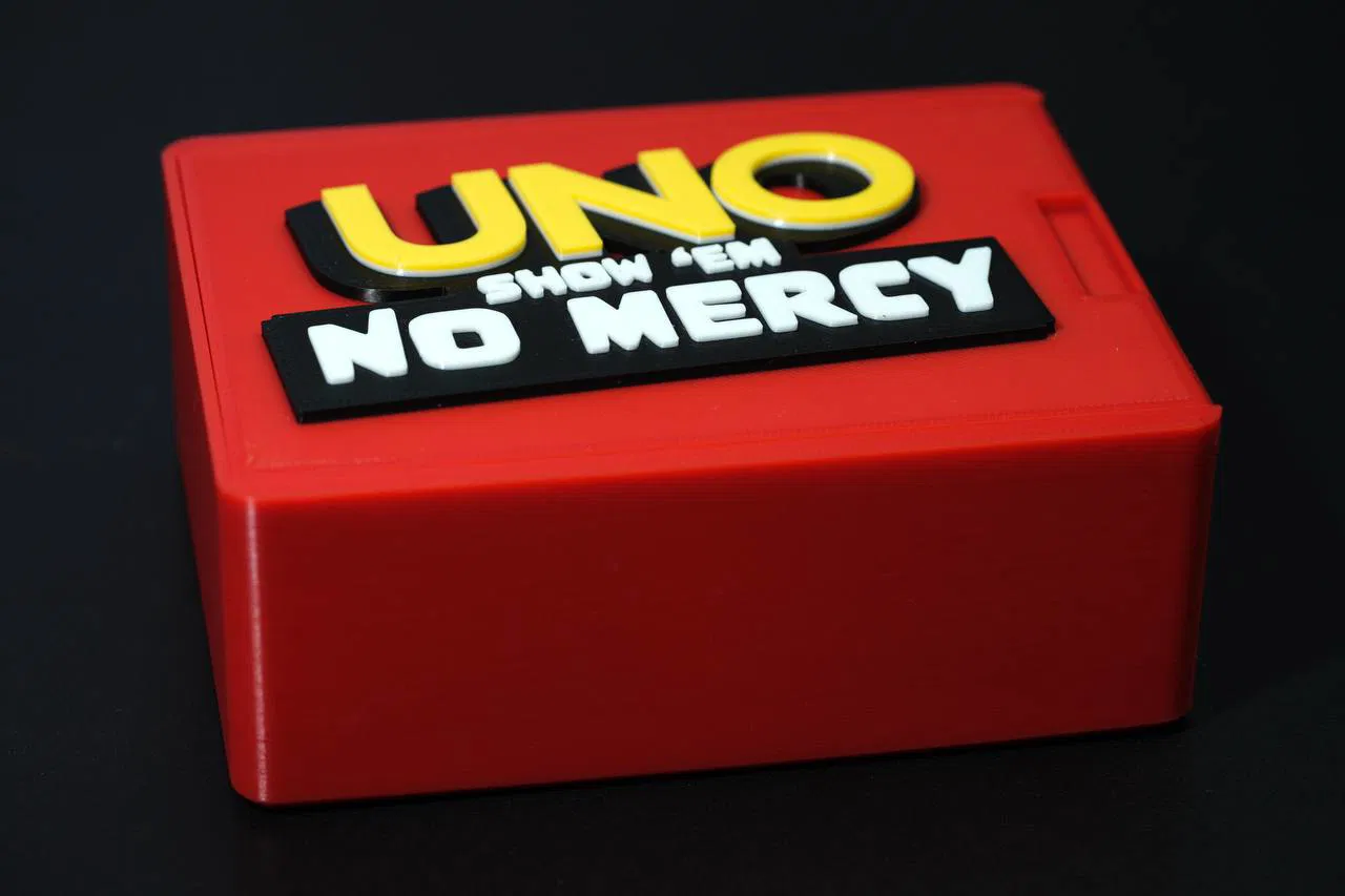 Mẫu hộp đựng thẻ bài UNO (UNO Card Box No Mercy) giúp cất gọn bộ bài, bảo vệ khỏi bụi và thất lạc. Phù hợp để mang theo khi đi chơi, lưu trữ tại nhà và giữ bộ bài luôn ngăn nắp.