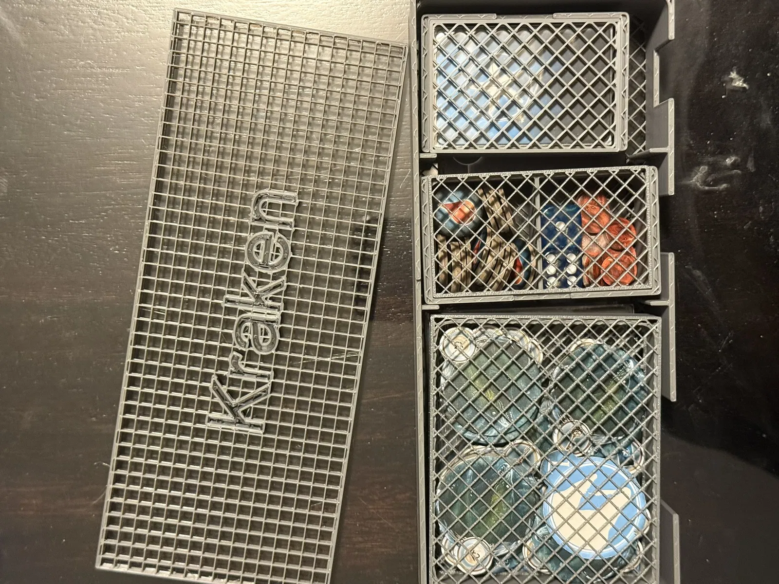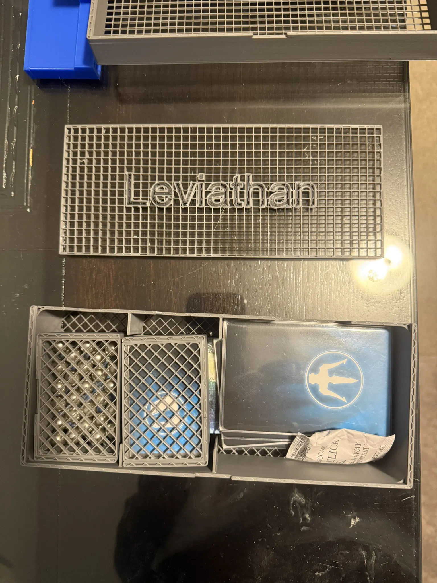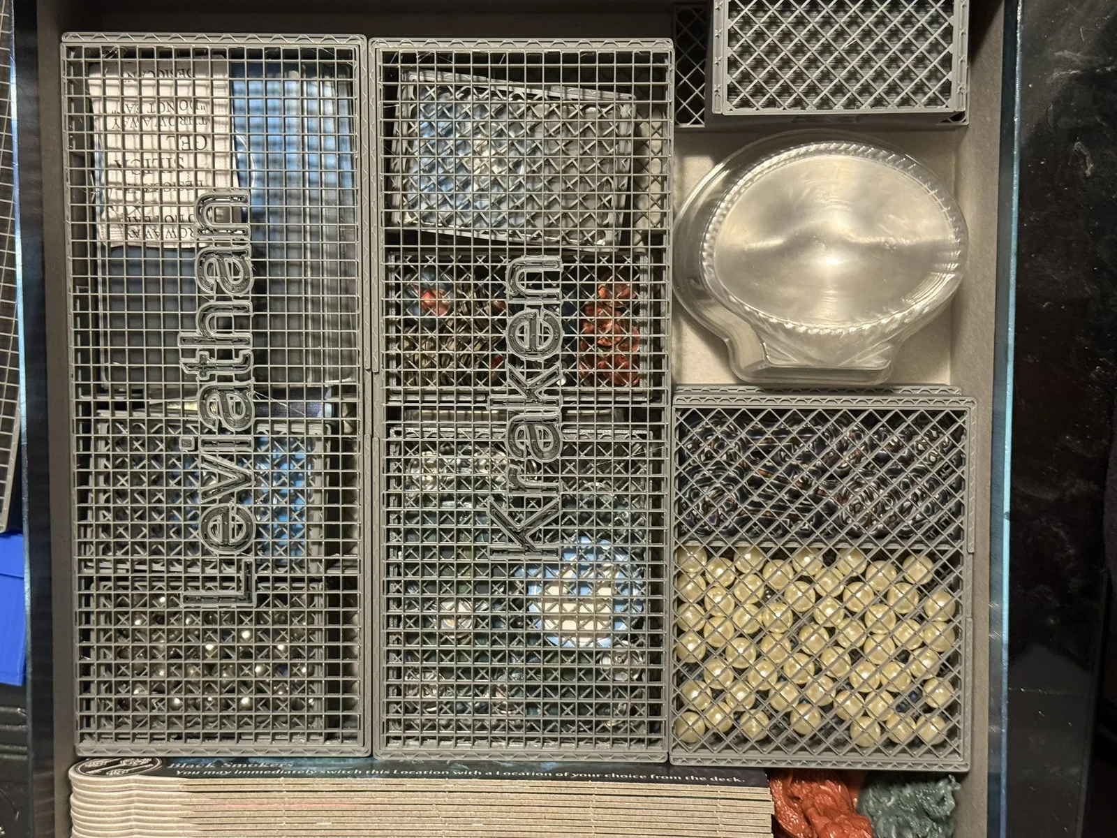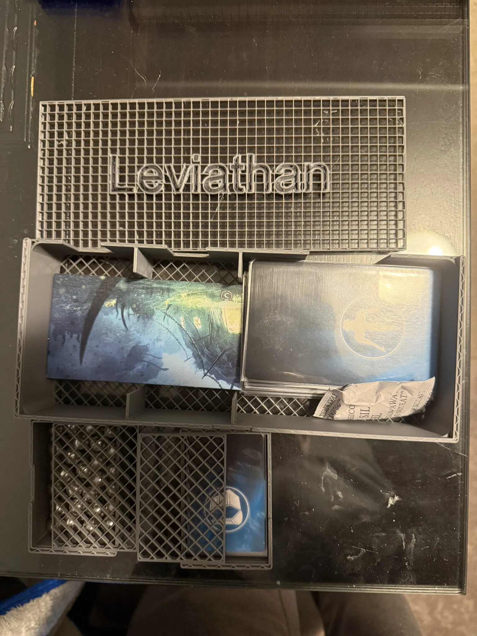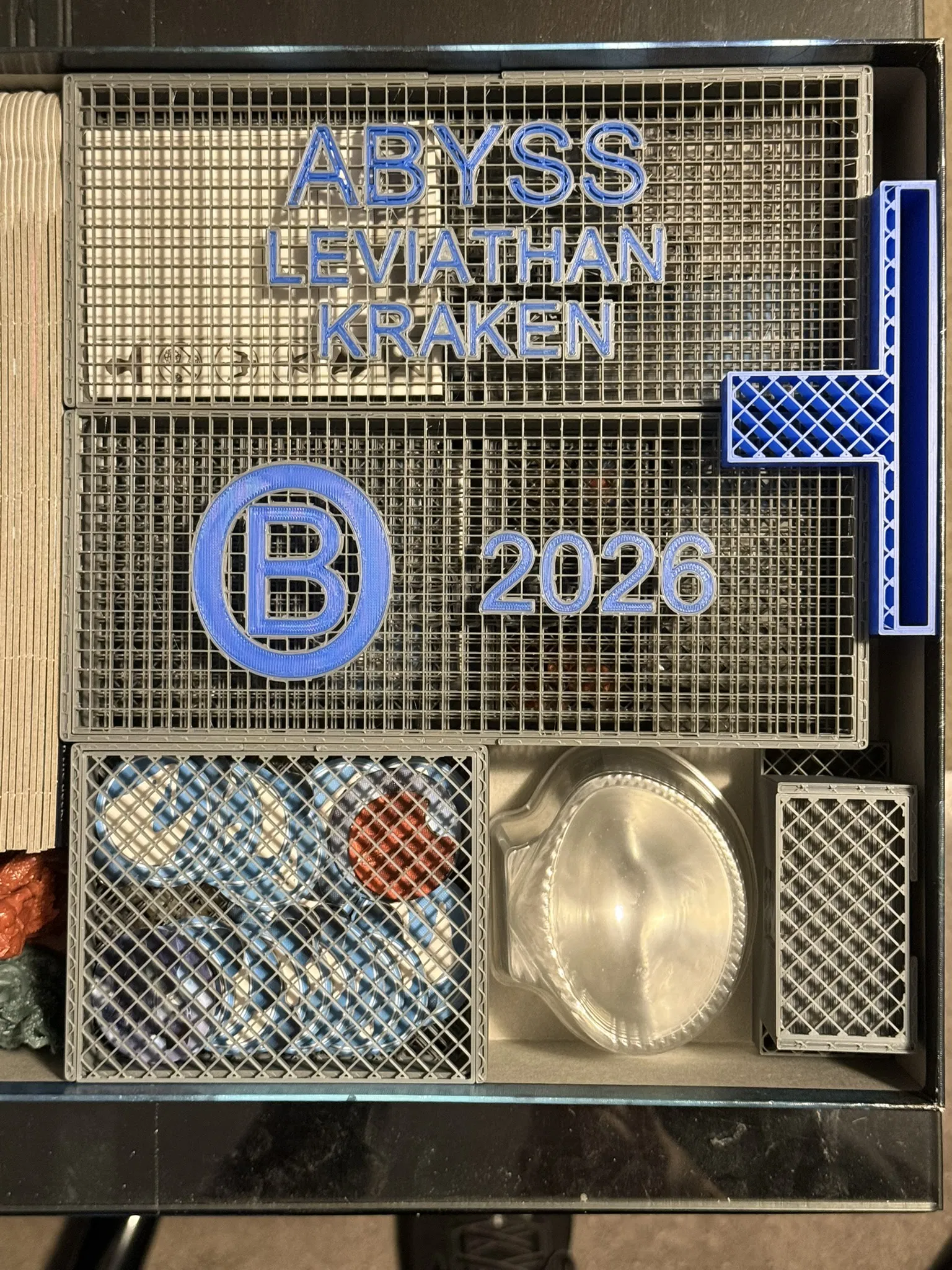 Insert/organizer cho Abyss kèm Kraken & Leviathan, hỗ trợ bài đã bọc sleeve (test Sleeve Kings), tối ưu giảm dùng PLA. Chứa trọn bộ thành phần, cất dọc gọn gàng; mỗi expansion có hộp riêng và có file 3MF hỗ trợ AMS.