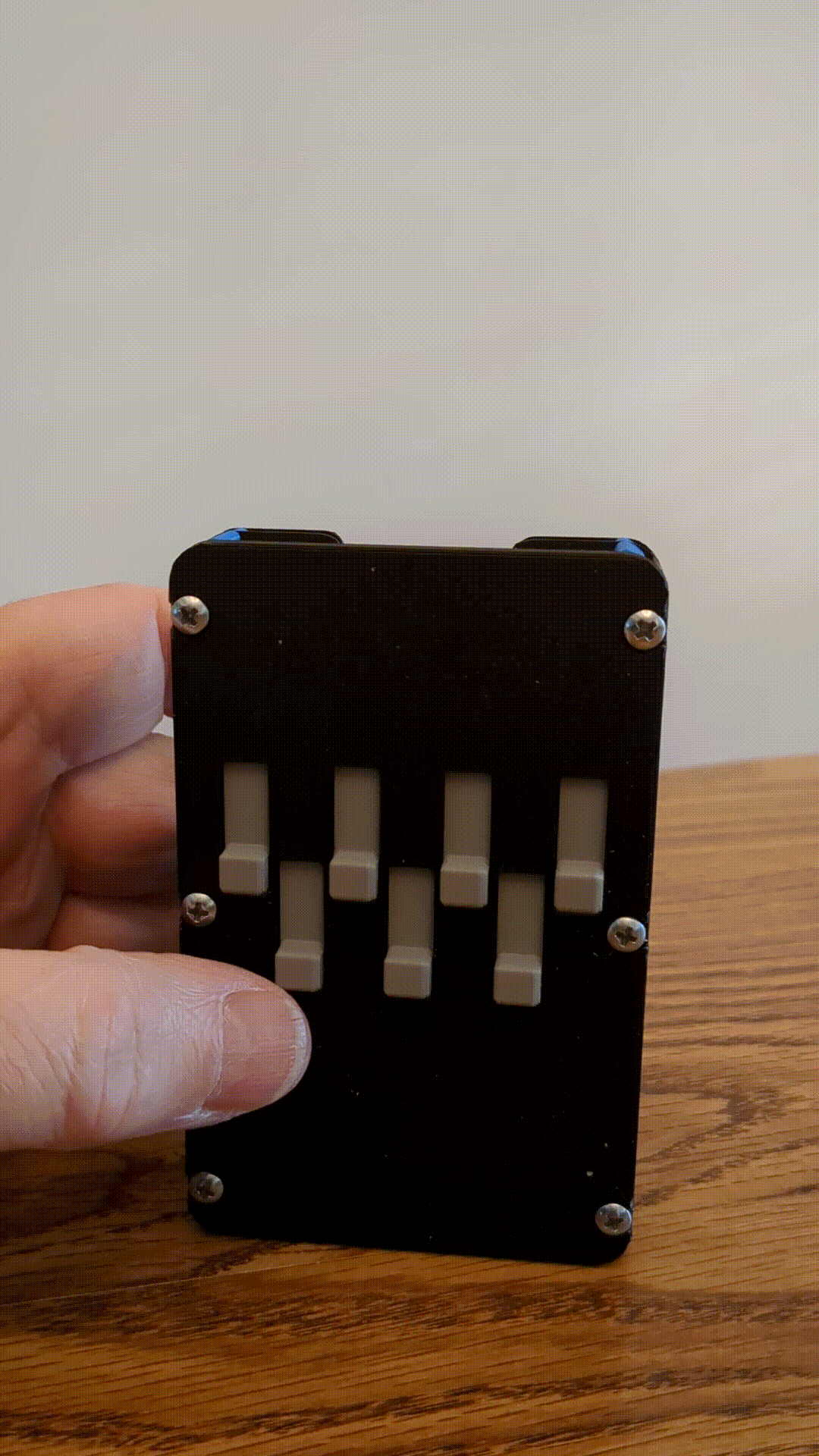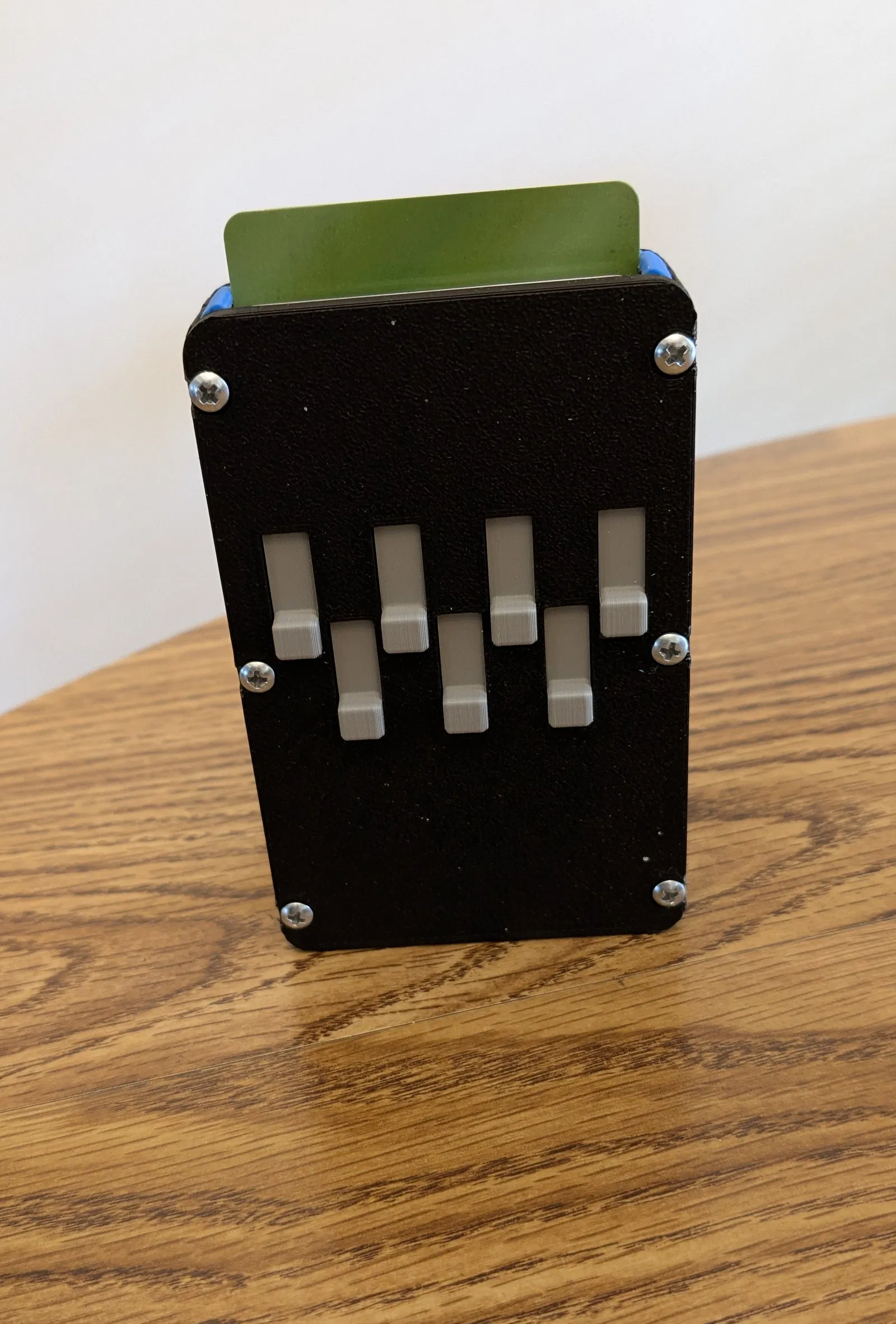 Mẫu Select-a-Card_Wallet giúp đẩy thẻ ra từng cái bằng cần trượt, dễ nhìn và rút/đút lại. Chứa tối đa 7 thẻ (có thể hơn nếu thẻ mỏng), có khay tiền/chìa khóa. Lắp bằng 6 ốc M3 hoặc #4.
