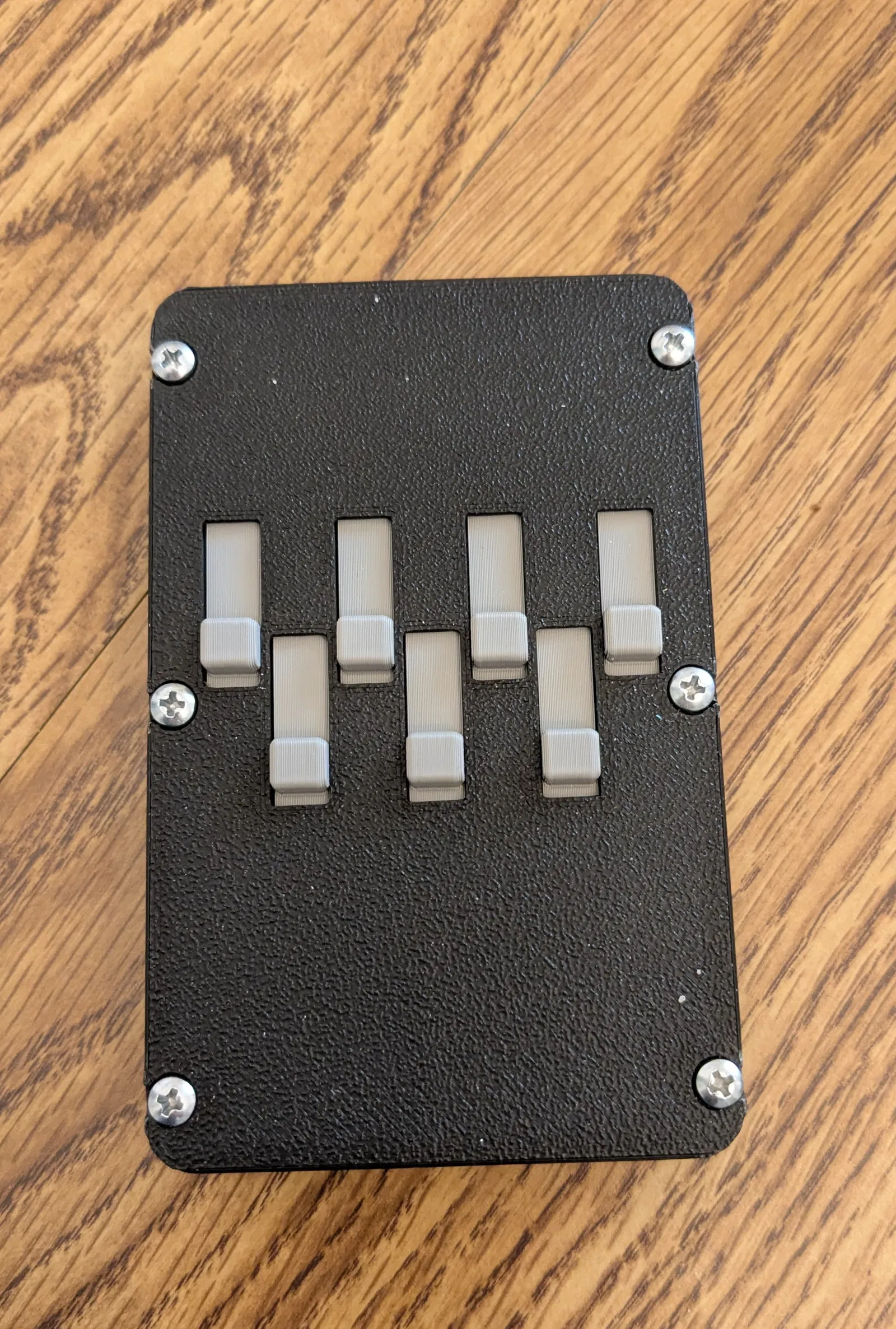 Bạn sẽ cần 6 con ốc để lắp ráp. Có thể dùng ốc tự ren M3 x 16mm hoặc ốc tôn #4 x ¾". Mình dùng ốc #4 vì dễ kiếm hơn. Tuy nhiên mình phải giũa bớt khoảng 1mm ở đầu ốc vì phần đầu bị lòi ra phía sau ví.