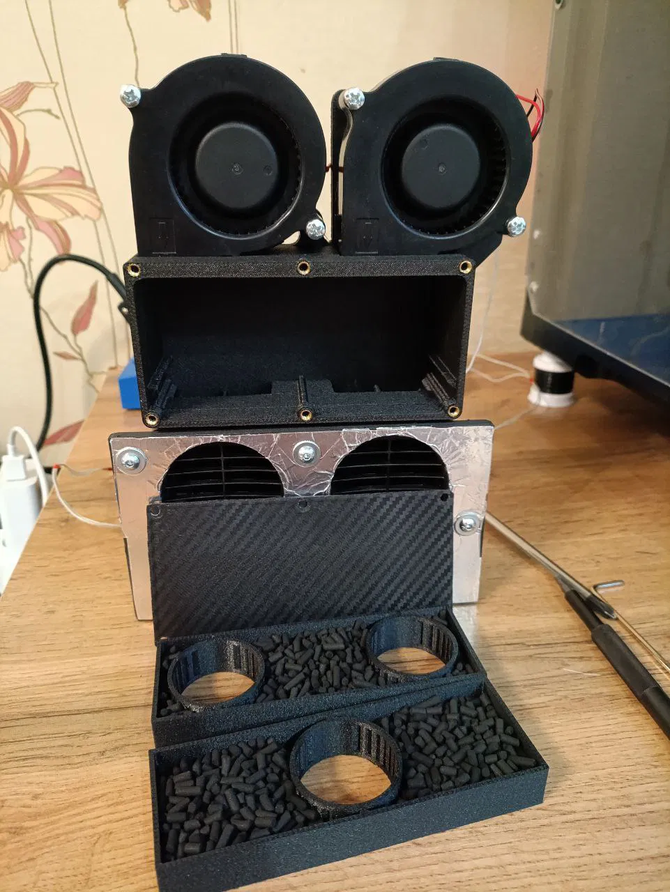Miếng sưởi này được thiết kế để tạo một “thermal camera” chủ động trên máy in Flashforge Adventurer 5M. Ngoài ra, trên miếng sưởi còn bổ sung thêm một module lọc không khí thông qua carbon filter.