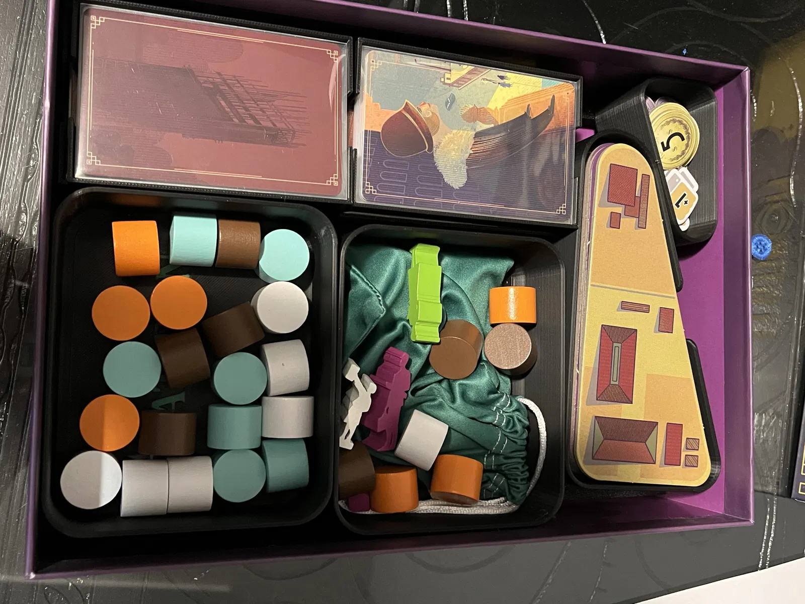 Mình dùng một cái túi để đựng các newspaper tokens, nhưng cũng có thể bỏ rời vào khay lớn luôn. Meeples và các cube thì mình để chung trong một khay khác. Mình cất hộp theo chiều dọc (store vertically) và không gặp vấn đề gì về việc đồ bị xê dịch trong hộp.