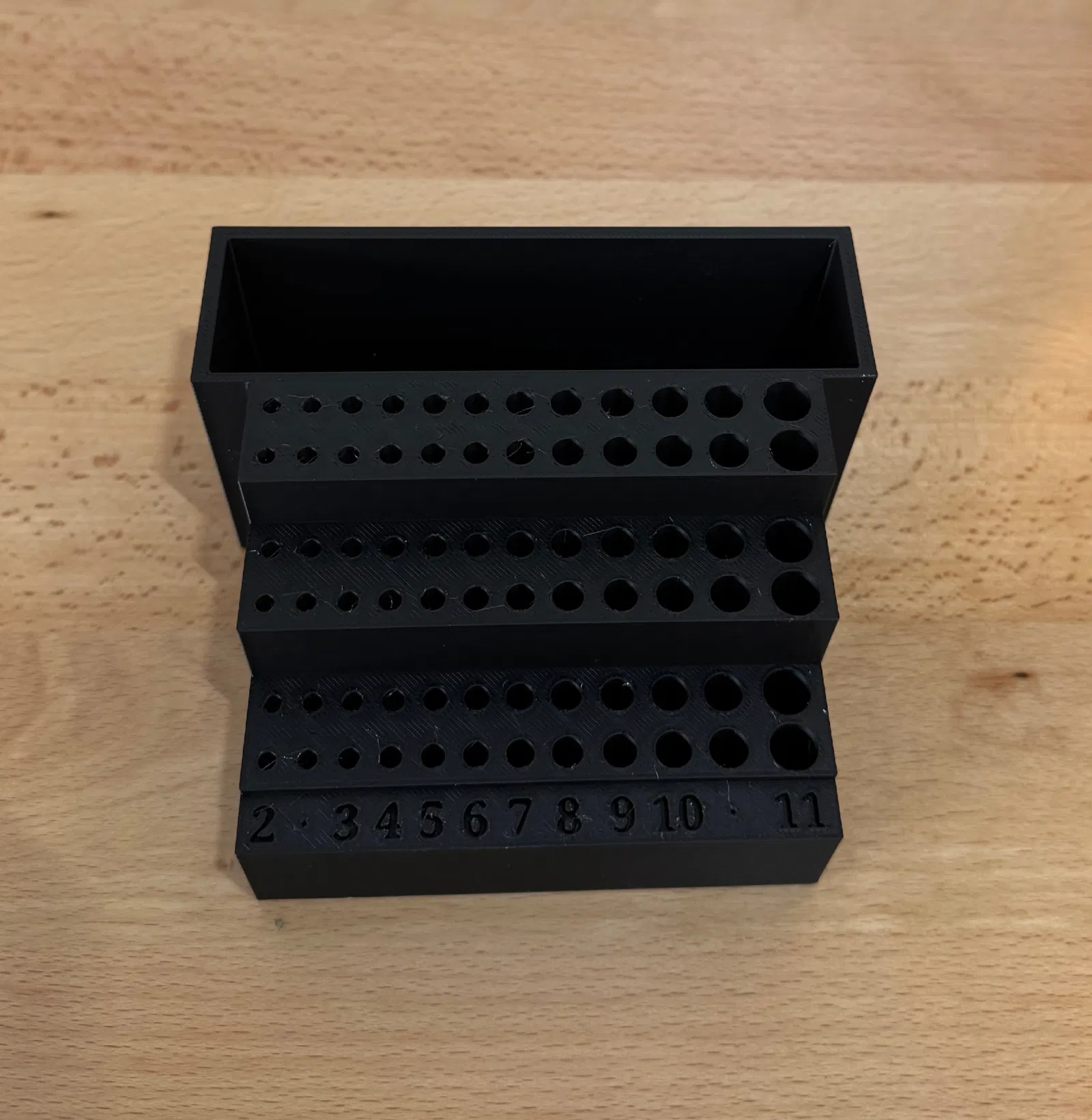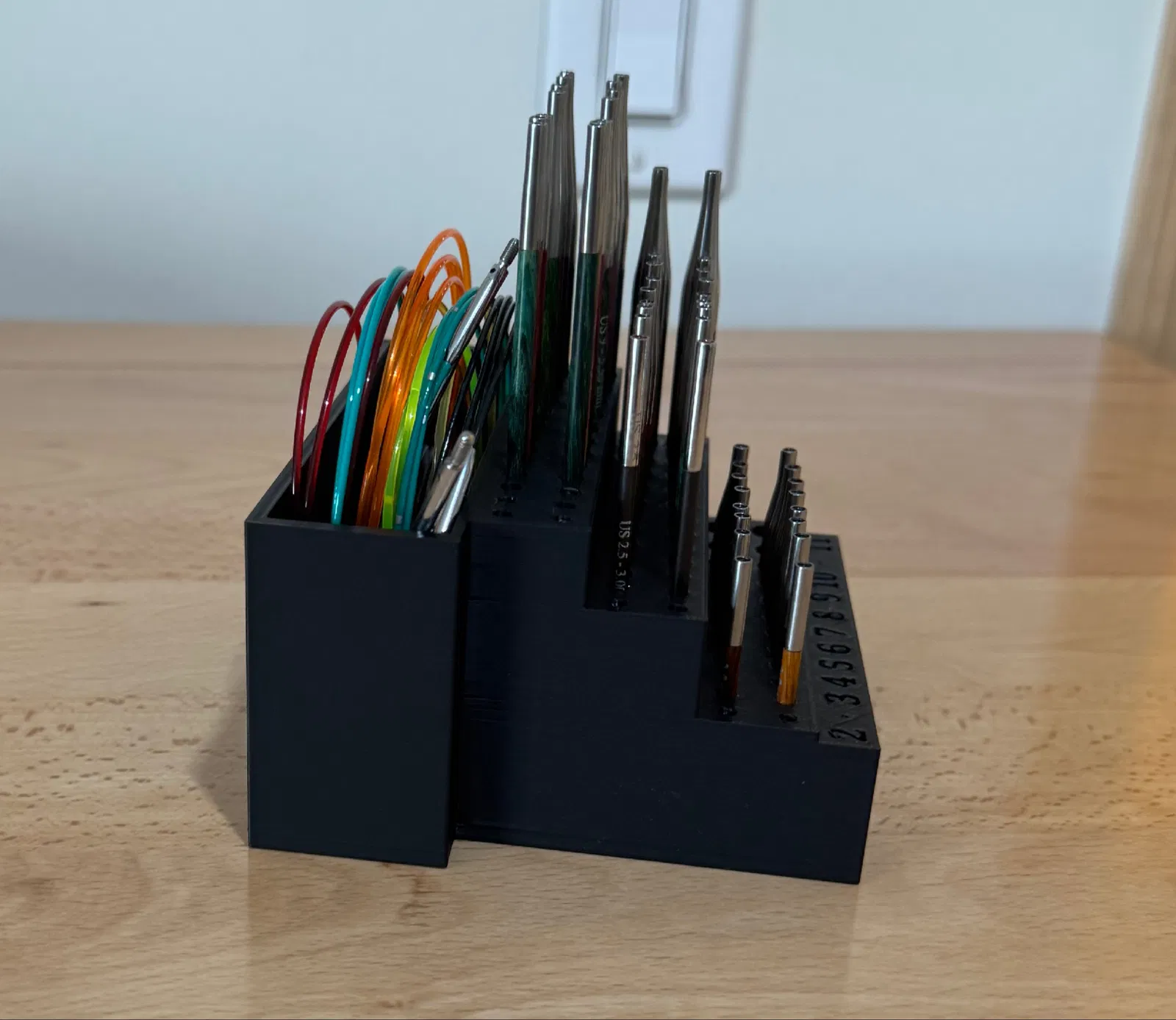 Khối lưu trữ dạng bậc thang cho 3 bộ kim đan interchangeable, có 12 size US và khoang sau để cất circular cables. Tối ưu cho KnitPro/Knitter’s Pride Dreamz & Symfonie, chừa clearance 0.4mm, có cập nhật tăng dung sai.