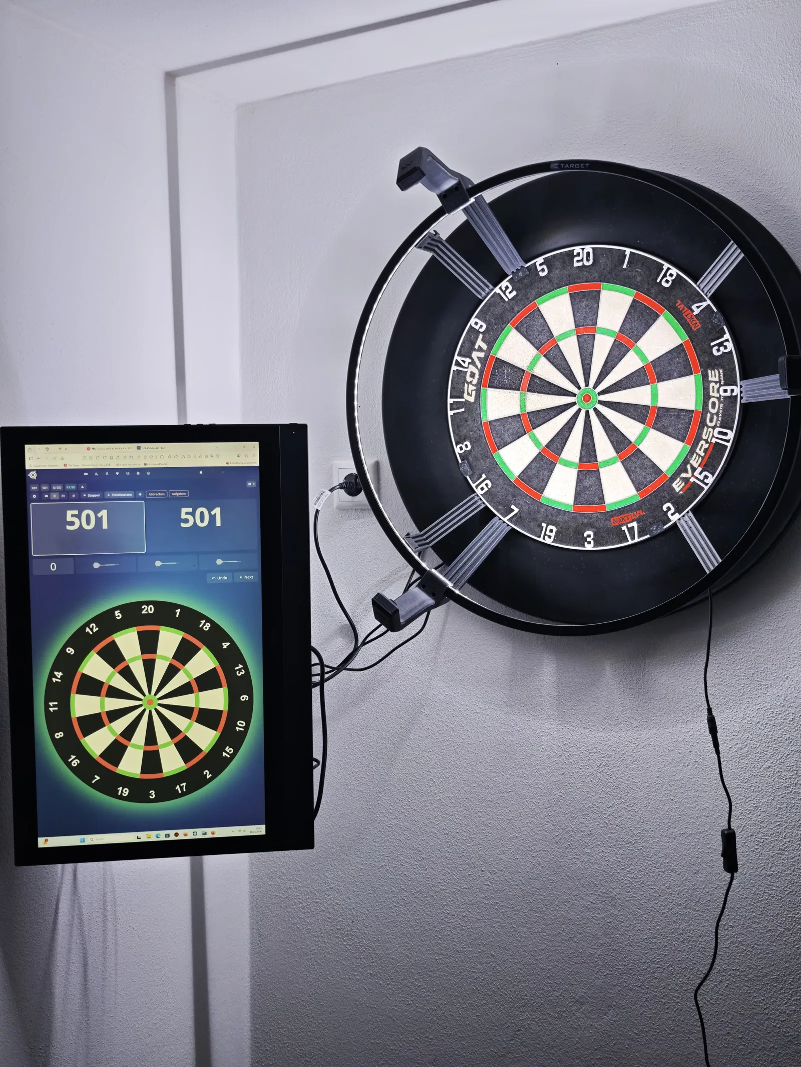7. Cụm Corona Vision mới gắn kèm tay camera sẽ được lắp giống như LED ring nguyên bản: dùng các “chân” ở tay camera dưới kẹp vào giữa dartboard và surround. Khi lắp, đi dây camera ra phía sau surround.