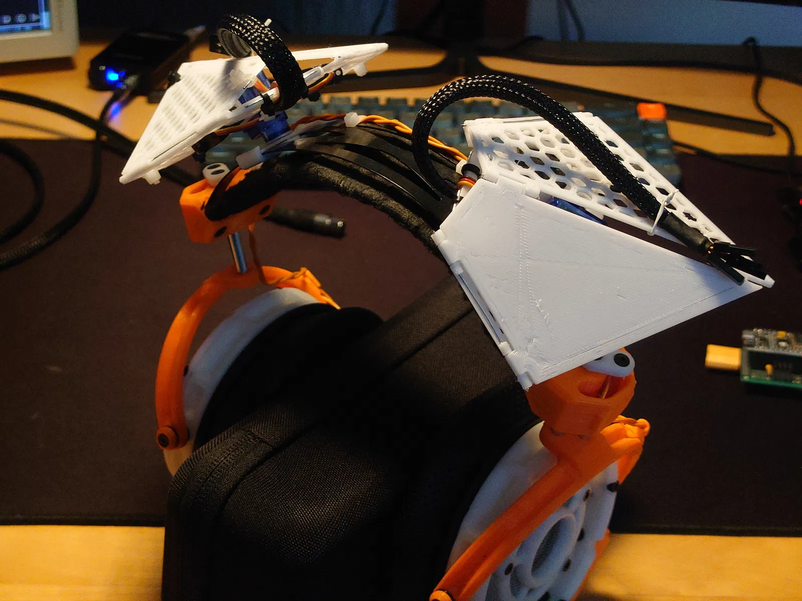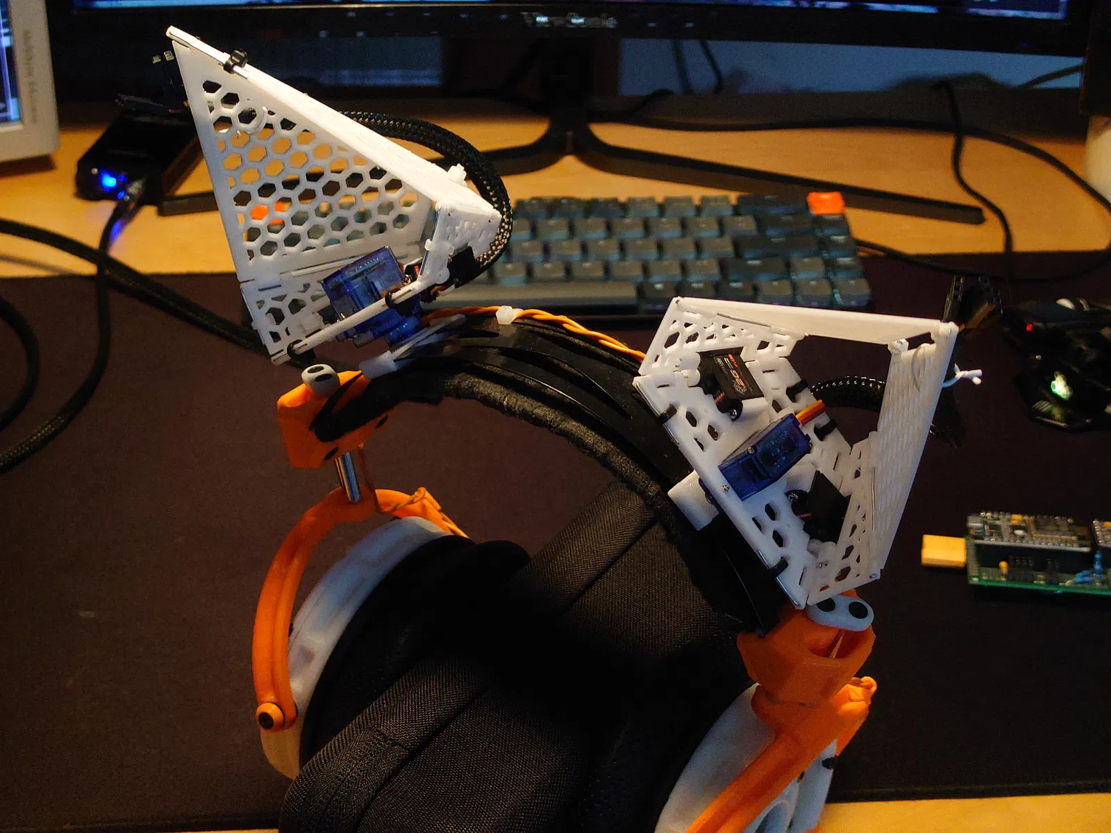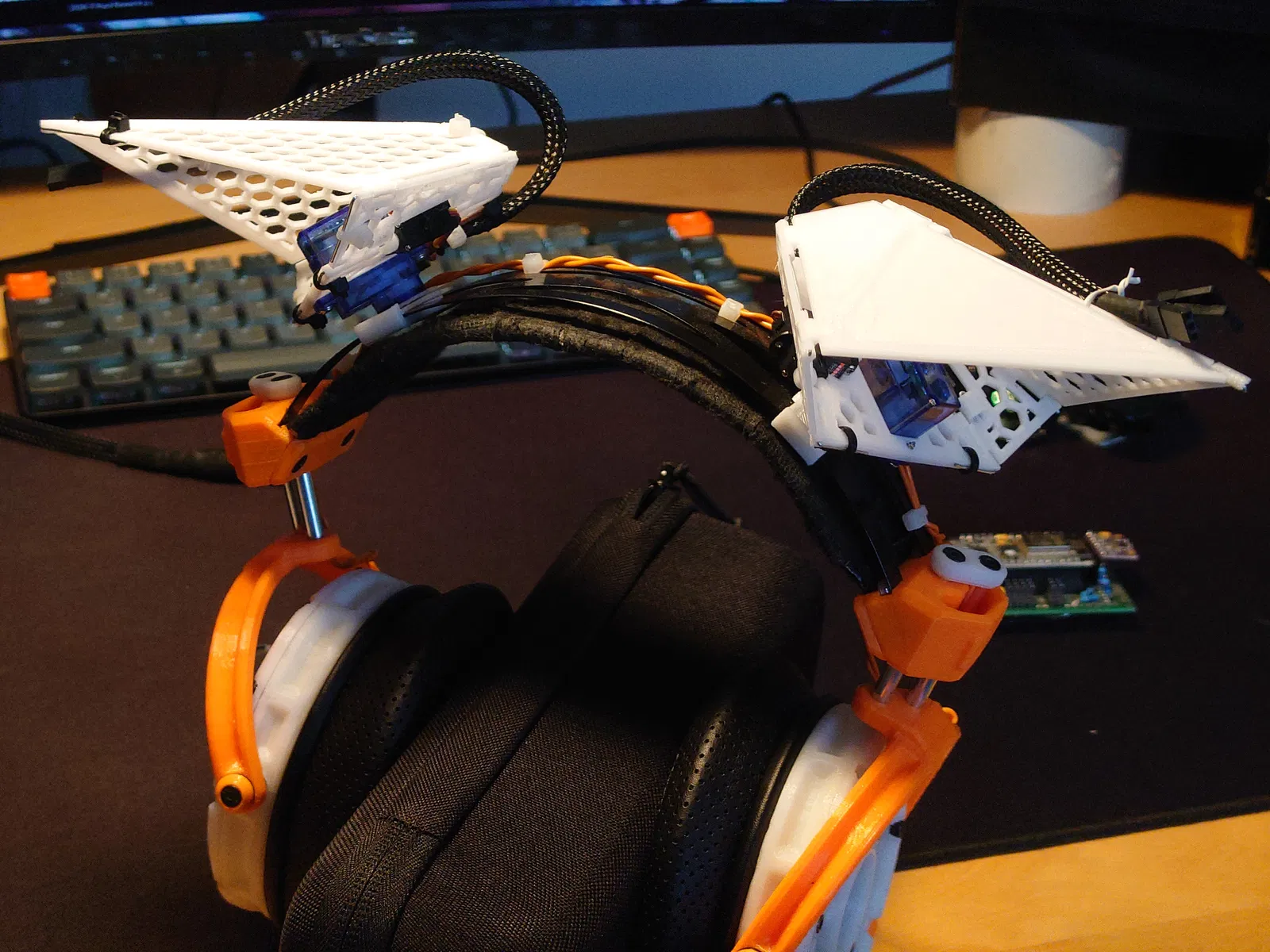 Mẫu tai mèo có khớp chuyển động (articulated/animated) để gắn lên tai nghe. Dùng thanh kim loại 1mm OD (paperclip cũng được) làm bản lề, hỗ trợ lắp servo 2g và có repo code tham khảo.