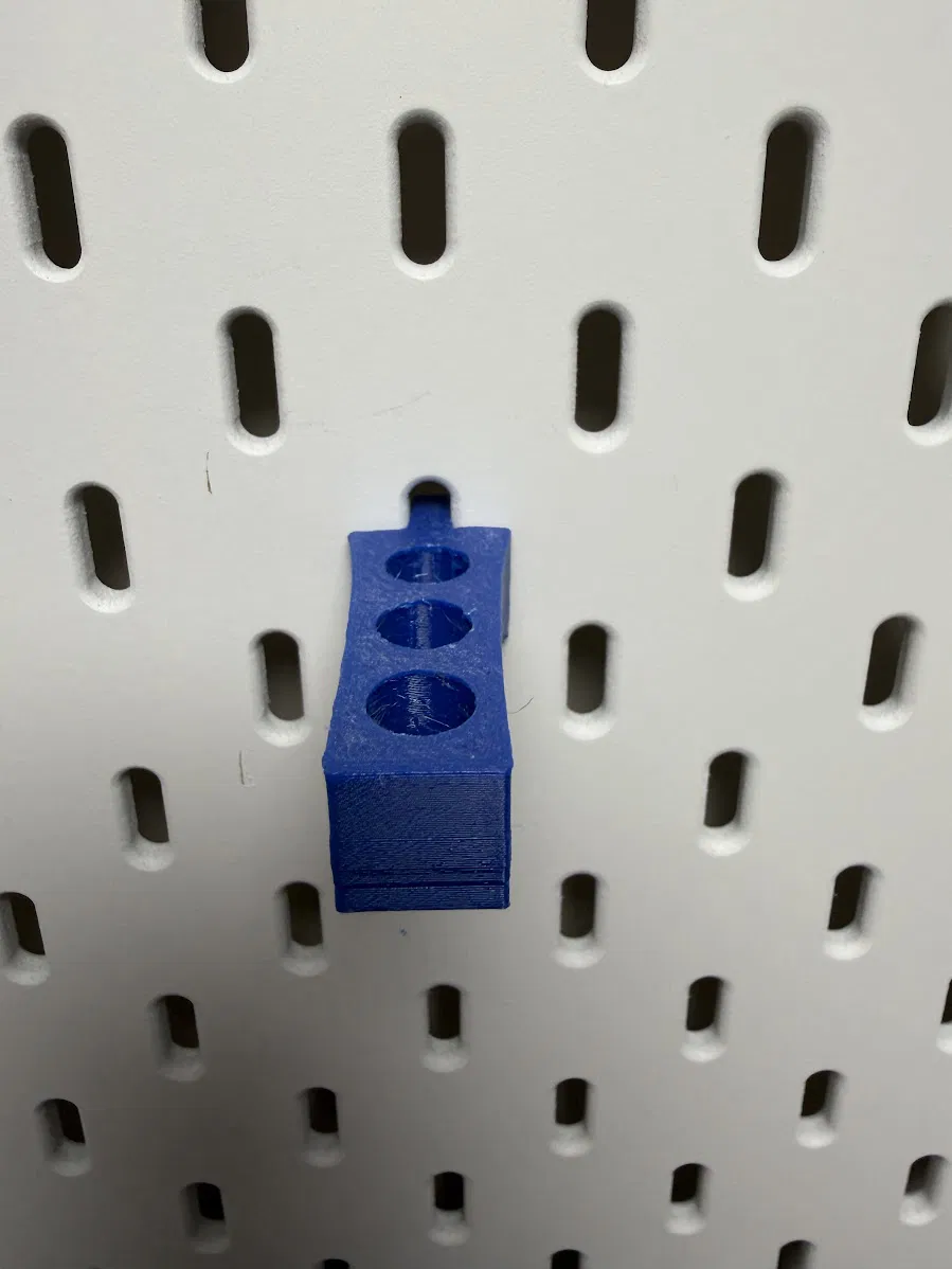 Giá đỡ tua vít cho pegboard IKEA Skadis với 3 lỗ. Thực tế giữ được 2 tua vít hoặc 1 cây loại lớn; gắn rất khít. In dễ, không cần supports. Khuyến nghị layer height 0.2mm, muốn mịn hơn thì 0.1mm.