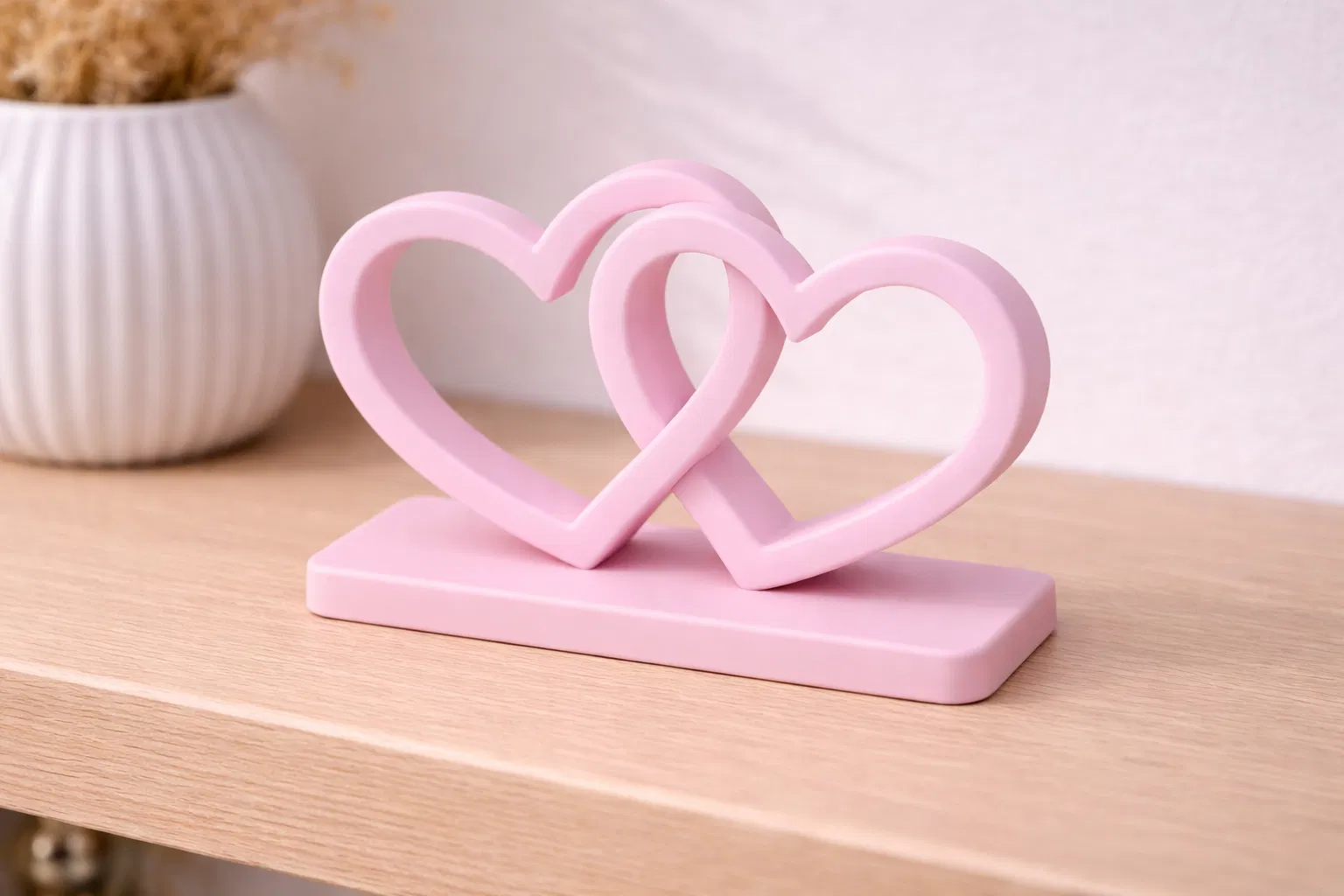 Mẫu decor 3D tối giản gồm hai trái tim lồng vào nhau trên đế vững, tượng trưng cho tình yêu và sự gắn kết. In đẹp với PLA/PETG, hợp trưng bàn, kệ; lý tưởng làm quà Valentine, kỷ niệm, cưới.
