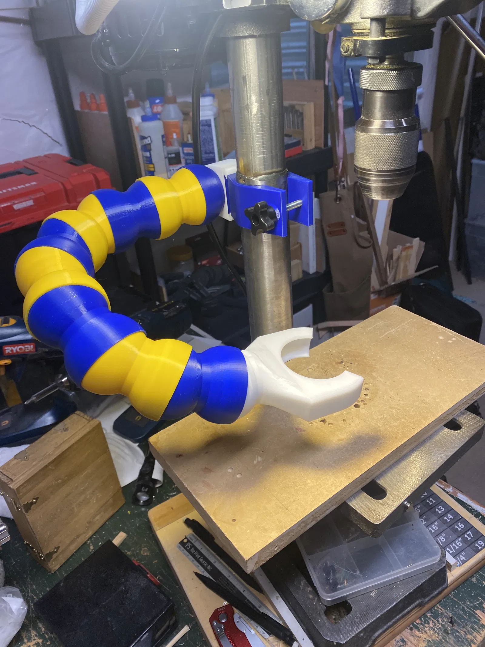 Đây là bản Remix của hệ thống ống hút bụi linh hoạt (segmented hose) dành cho máy khoan bàn WEN. Thiết kế bao gồm kẹp gắn cho trụ 48mm, phần giữ adapter được gia cố chắc chắn hơn và đầu hút bụi dạng hở tiện lợi.
