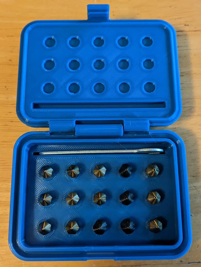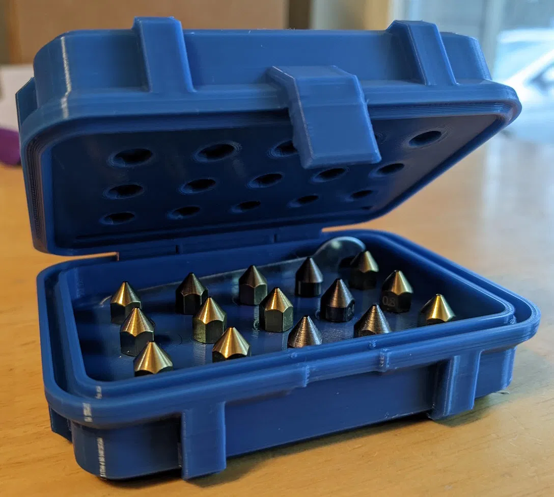 Bản REMIX từ Parametric Rugged Box, tích hợp bản lề print-in-place và chỉnh nhẹ phần ngàm. In 1 lần là dùng ngay, không cần assembly. Hộp chứa 15 nozzle và 1 nozzle wrench; không cần supports (có dùng cũng được).