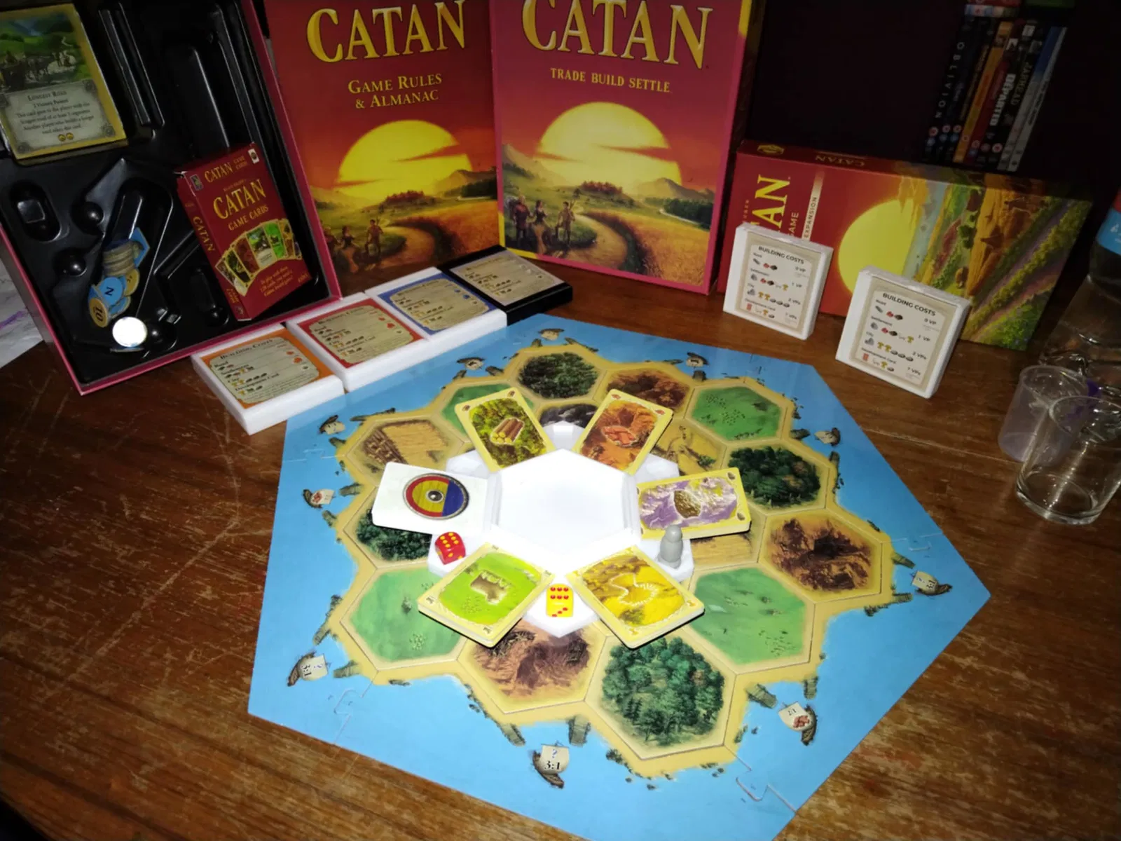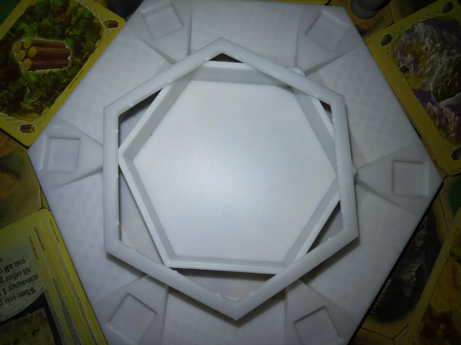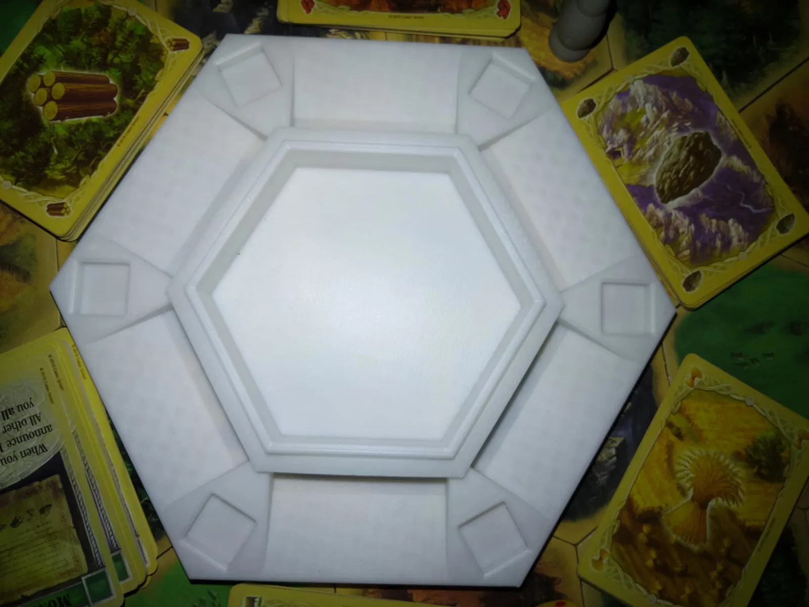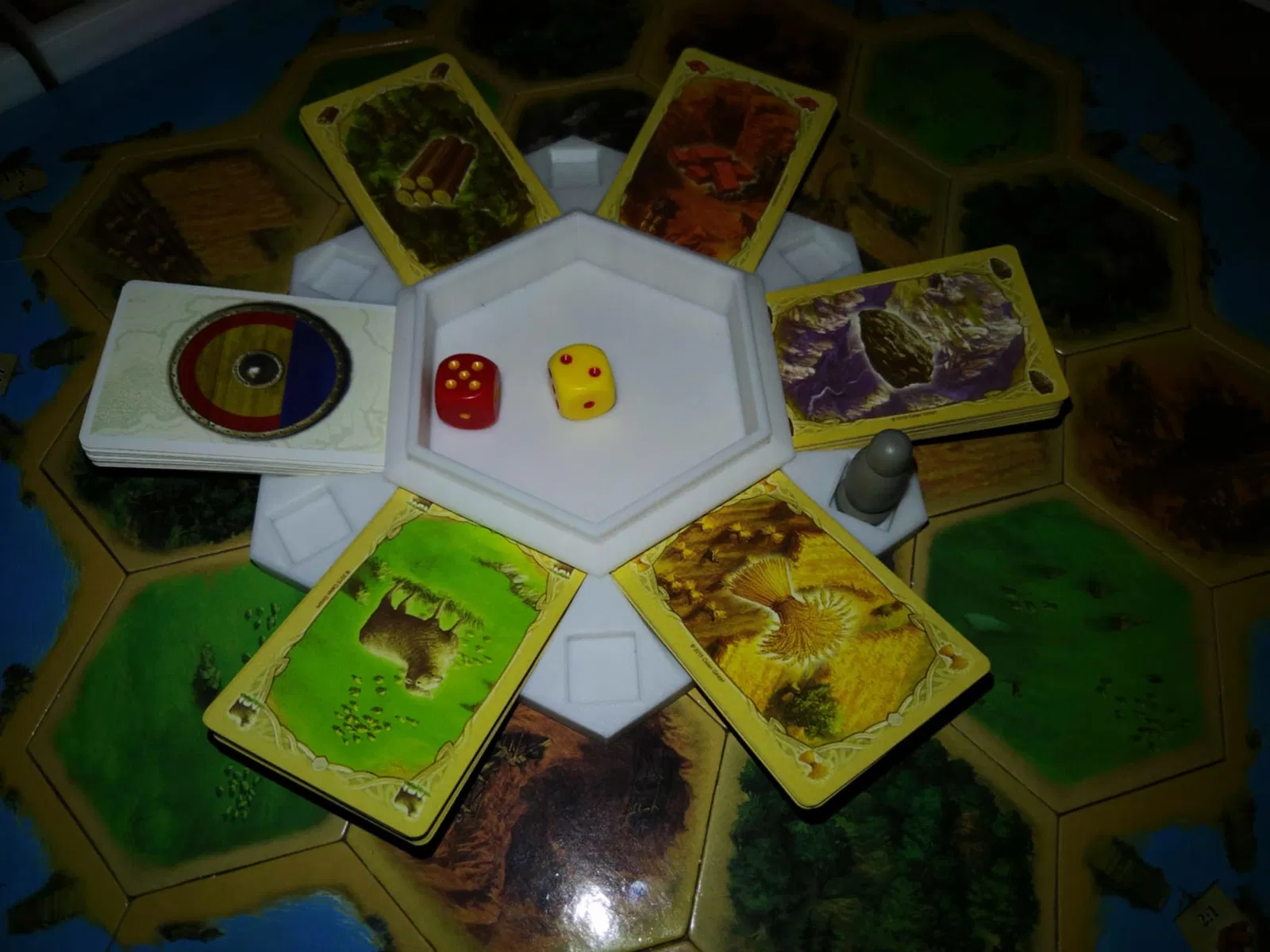 Thẩm mỹ theo chủ đề: Dáng lục giác khớp chuẩn hình học Catan, đặt vào trung tâm setup là “hợp rơ” liền.