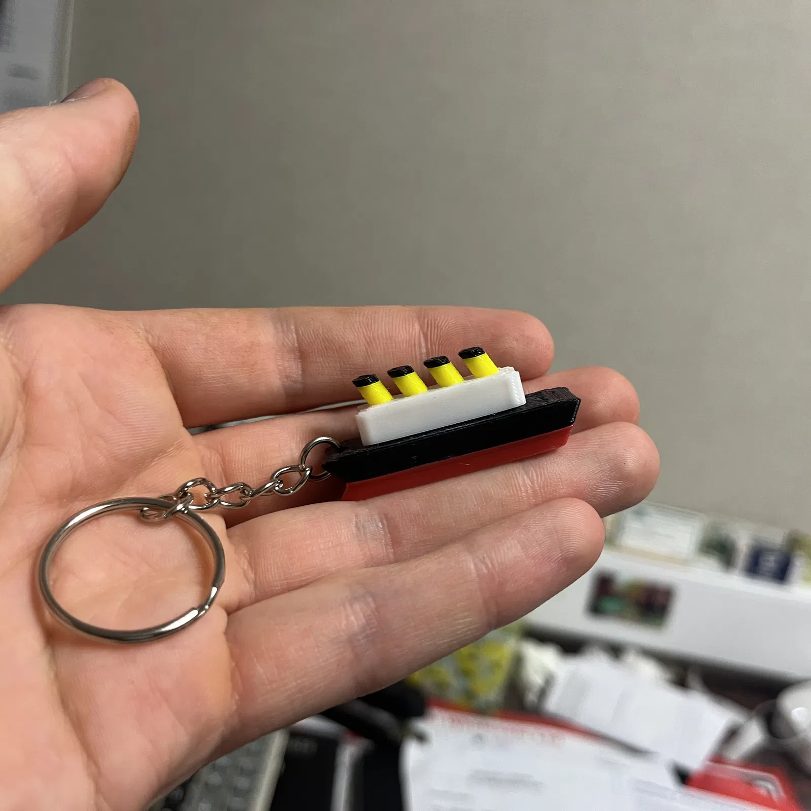 Mẫu 3D Titanic dạng móc khóa, có sẵn lỗ để gắn keychain/keyring. Có thể in 3 phần rồi dán bằng superglue, hoặc in nguyên khối và filament swap để tạo màu. Thiết lập tham khảo: Ender 3, layer height 0.2mm.