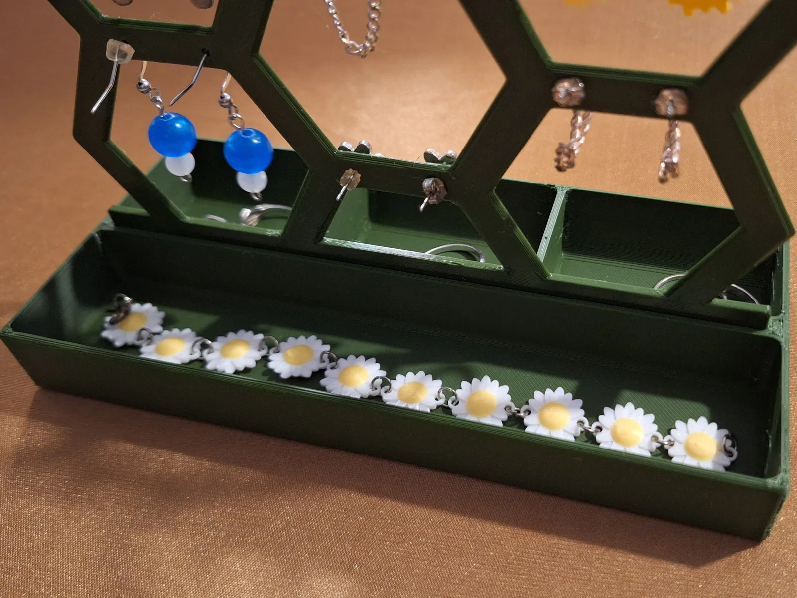 Khay có nhiều lựa chọn. Bạn có thể để bất cứ thứ gì: vòng tay, dây chuyền, piercing, nhẫn hoặc mấy đôi khuyên tai không vừa treo trong các ô lục giác.