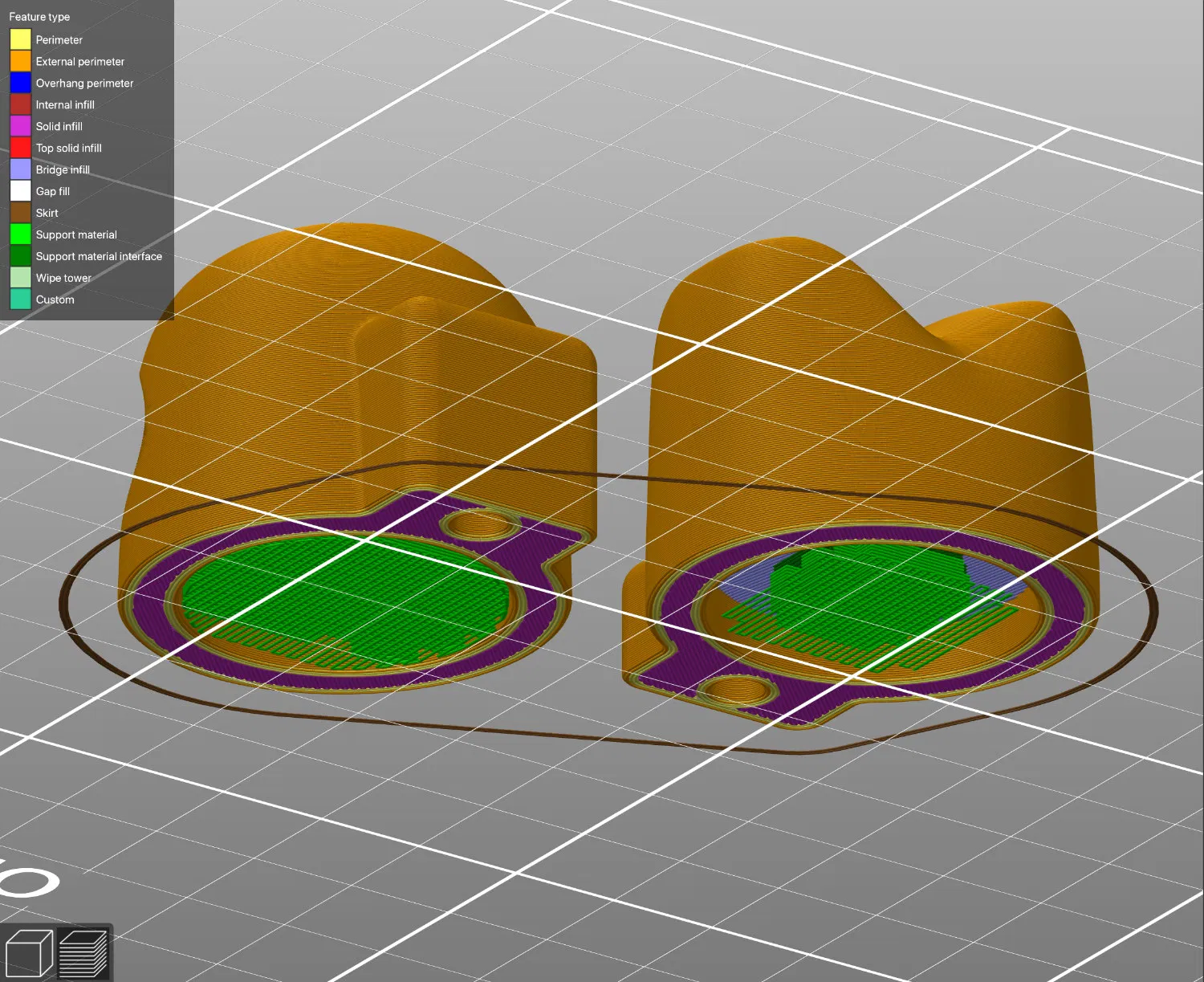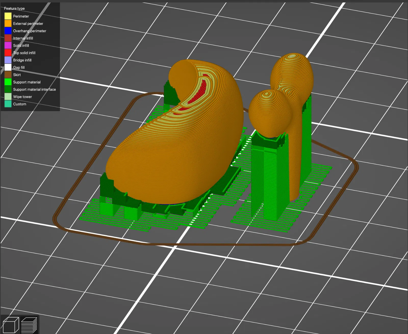 - Visor nên đặt trên bed theo đúng hướng nó nằm trên nhân vật. Dù diện tích tiếp xúc với bed ít, supports xung quanh vẫn đủ (nên không cần brim ngoài supports).