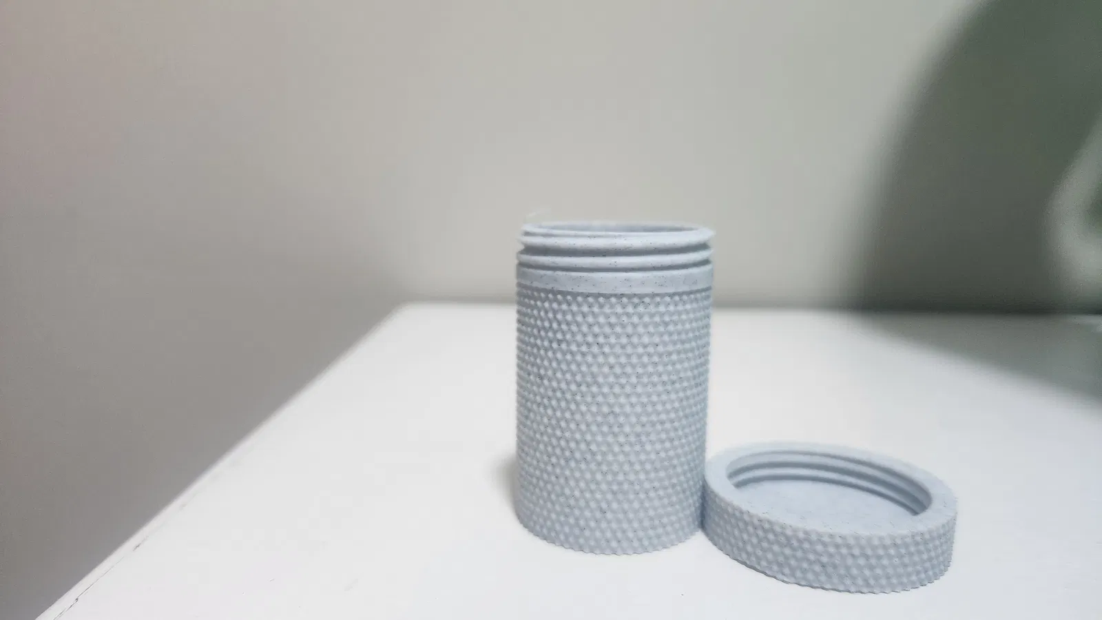 Đây là một hộp chứa đồ dạng hình trụ có bề mặt knurling (vân nhám chống trượt).