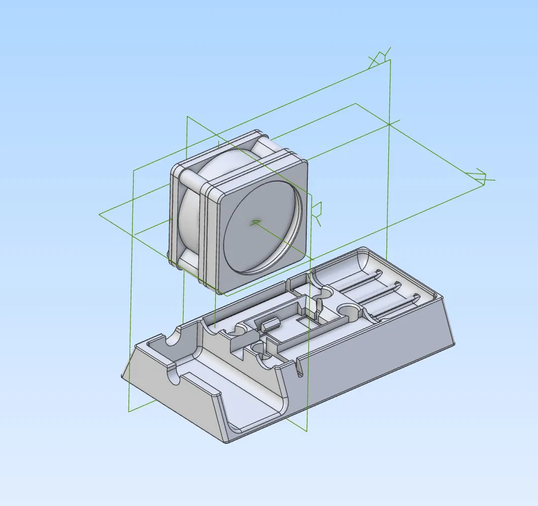 Đa số quạt 60mm đều xài được; tuy nhiên đang làm giữa chừng thì mình phát hiện cái buck converter này không thích chạy với combo 2x pin AA và đúng cái quạt này (một số quạt khác thì chạy ổn), nên mình thêm một rãnh riêng để đi dây USB vào đế. (Đúng là trường hợp này mình có thể bỏ luôn buck converter, nhưng mình đã không làm vậy. Mình để lại để sau này có thể dùng pack 4x AA (đã test bằng dây dupont thì chạy với converter, khác với chỉ 2x AA)).
