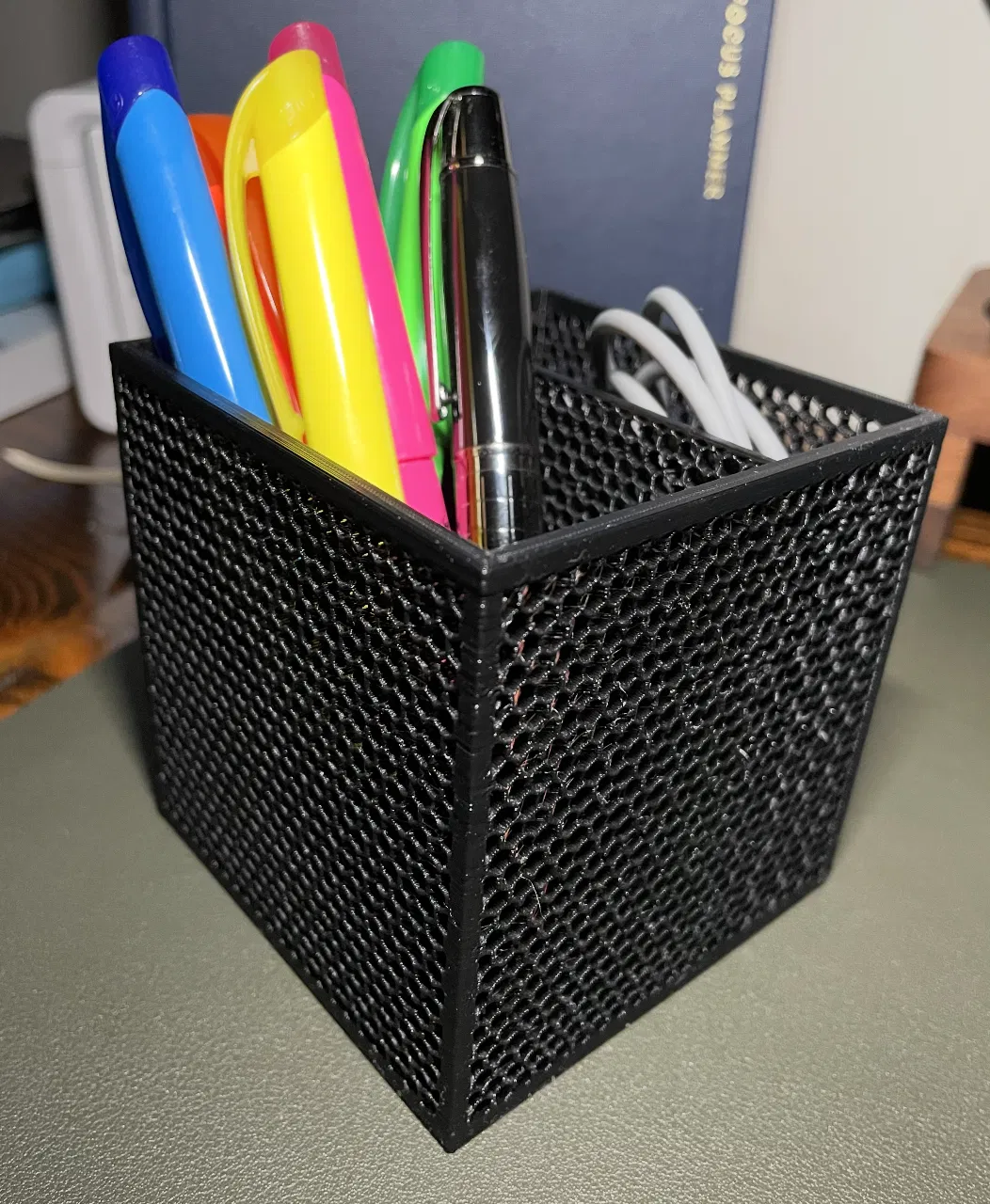 Thành hộp dạng hex mesh mở giúp thông thoáng và dễ nhìn bên trong, đồng thời vẫn giữ độ cứng vững, rất hợp để dùng trên bàn làm việc, kệ, phòng làm đồ thủ công, lớp học hoặc xưởng.