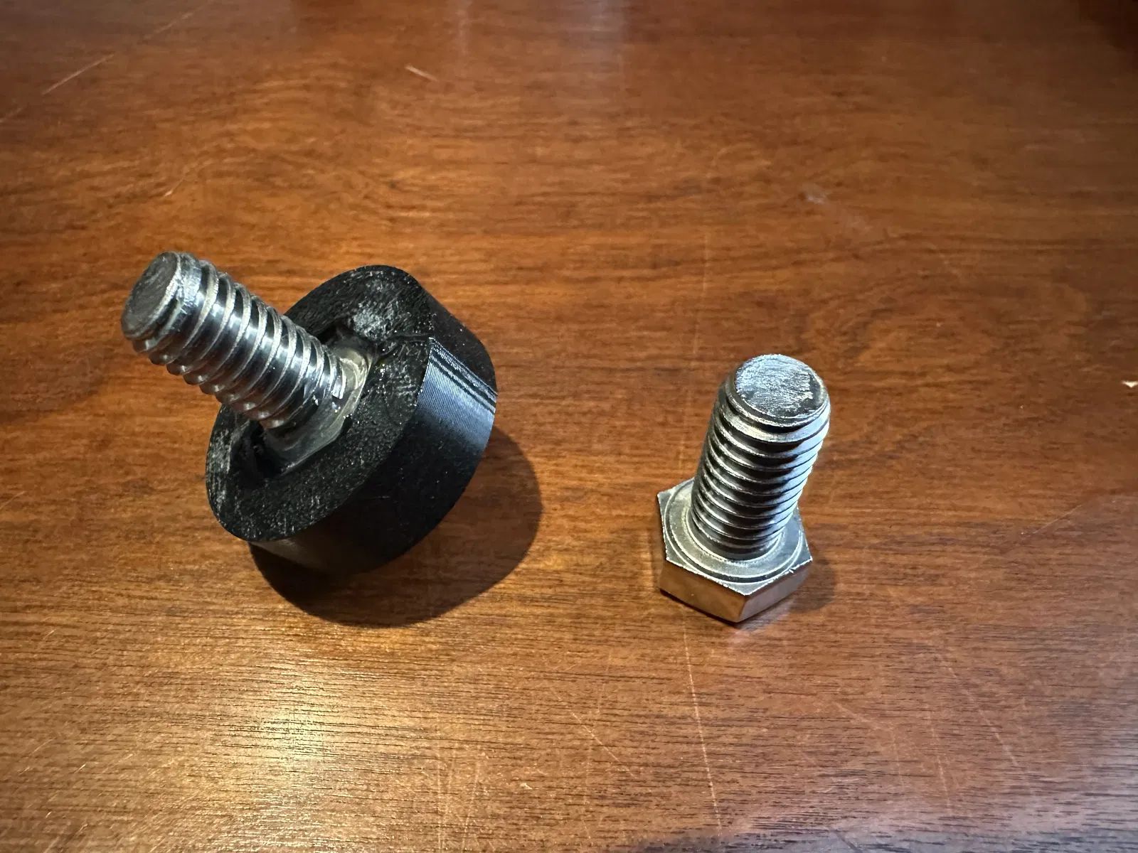 Mình dùng một con bu lông đầu lục giác 3/8" 16 TPI dài 3/4" bằng inox. Mình in phần chân với mặt phẳng úp xuống và bật supports từ build plate. Vật liệu là Siraya 85A TPU màu đen — mình nghĩ đa số filament TPU đều in ổn.