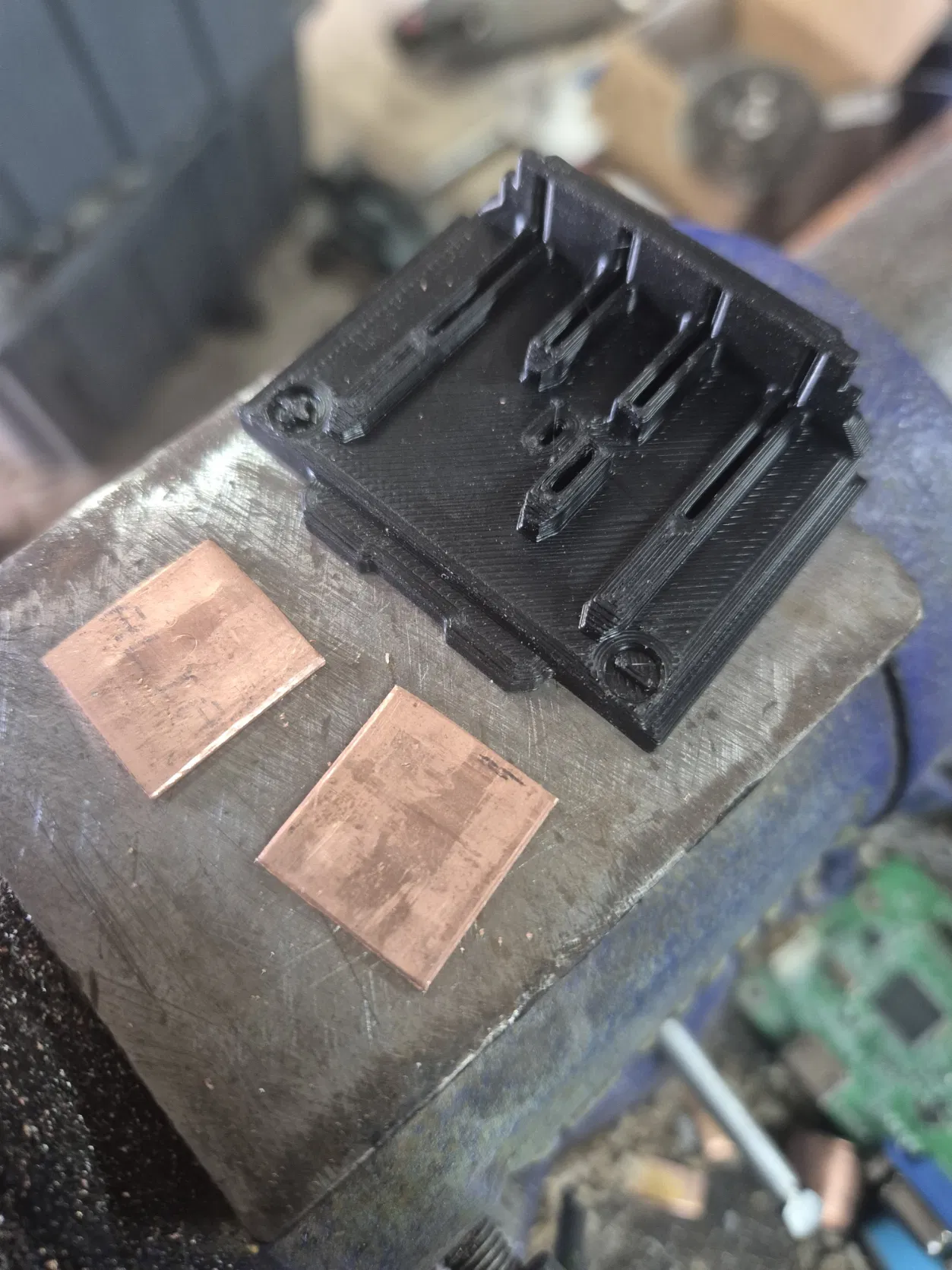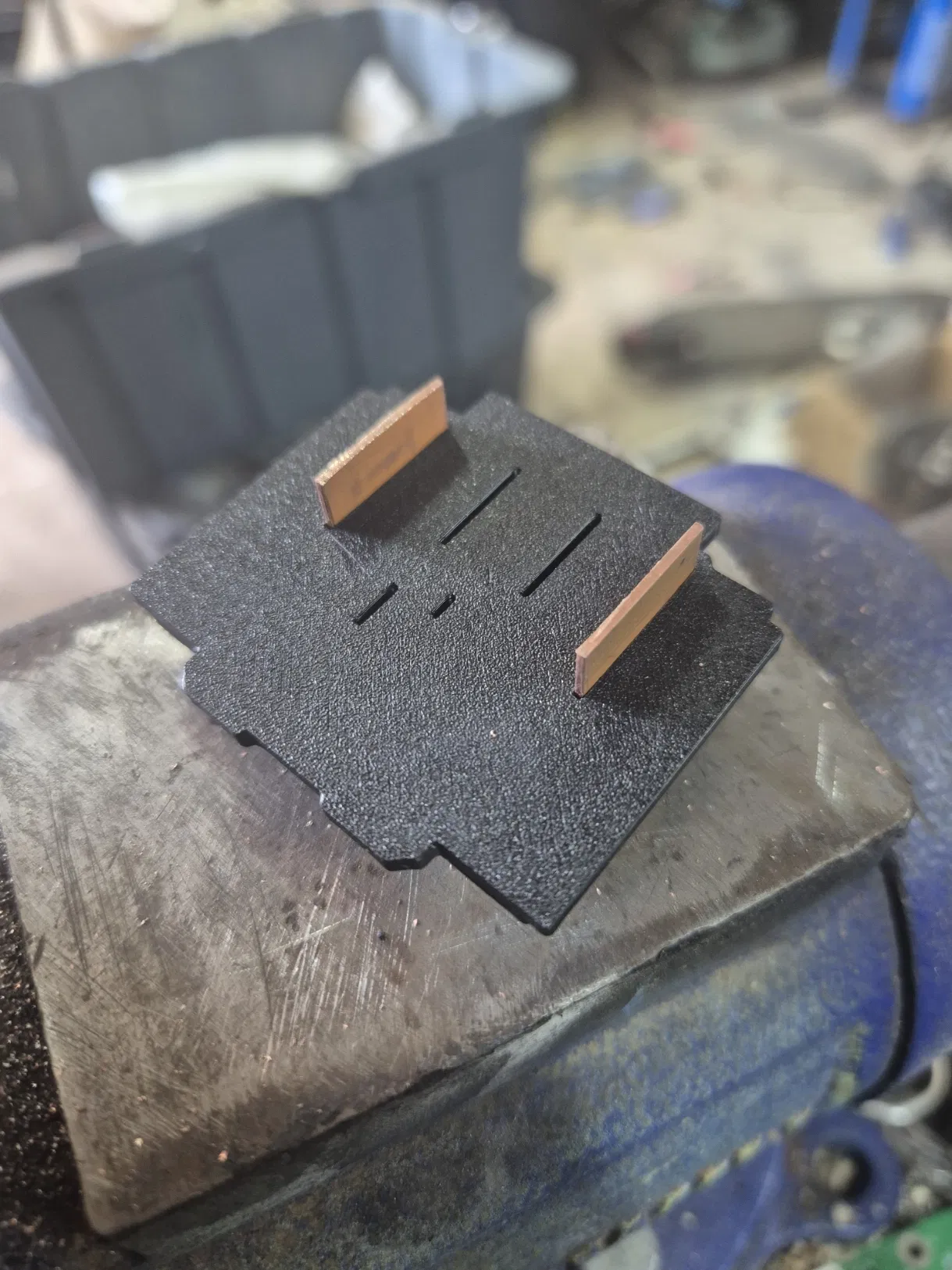 Bản copy của khối terminal Makita XGT 40V được mình dựng trong Fusion. Phần lá tiếp xúc dùng ống đồng cán dẹp, cắt theo kích thước 17x18mm để làm các tab.