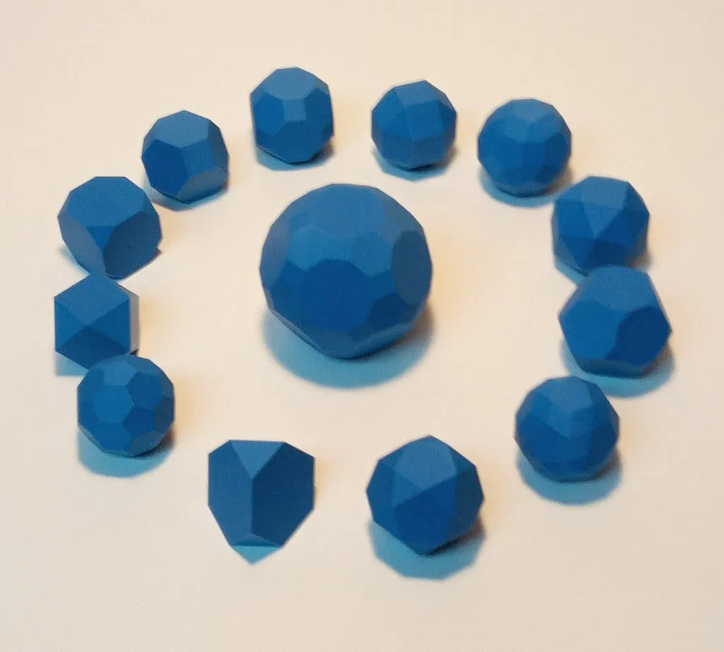 Bộ sưu tập gồm đầy đủ 18 khối đa diện kinh điển: 5 khối Platonic và 13 khối Archimedean. Phù hợp cho học tập STEM, hình học và toán học, dùng để trực quan hóa các khái niệm đa diện.