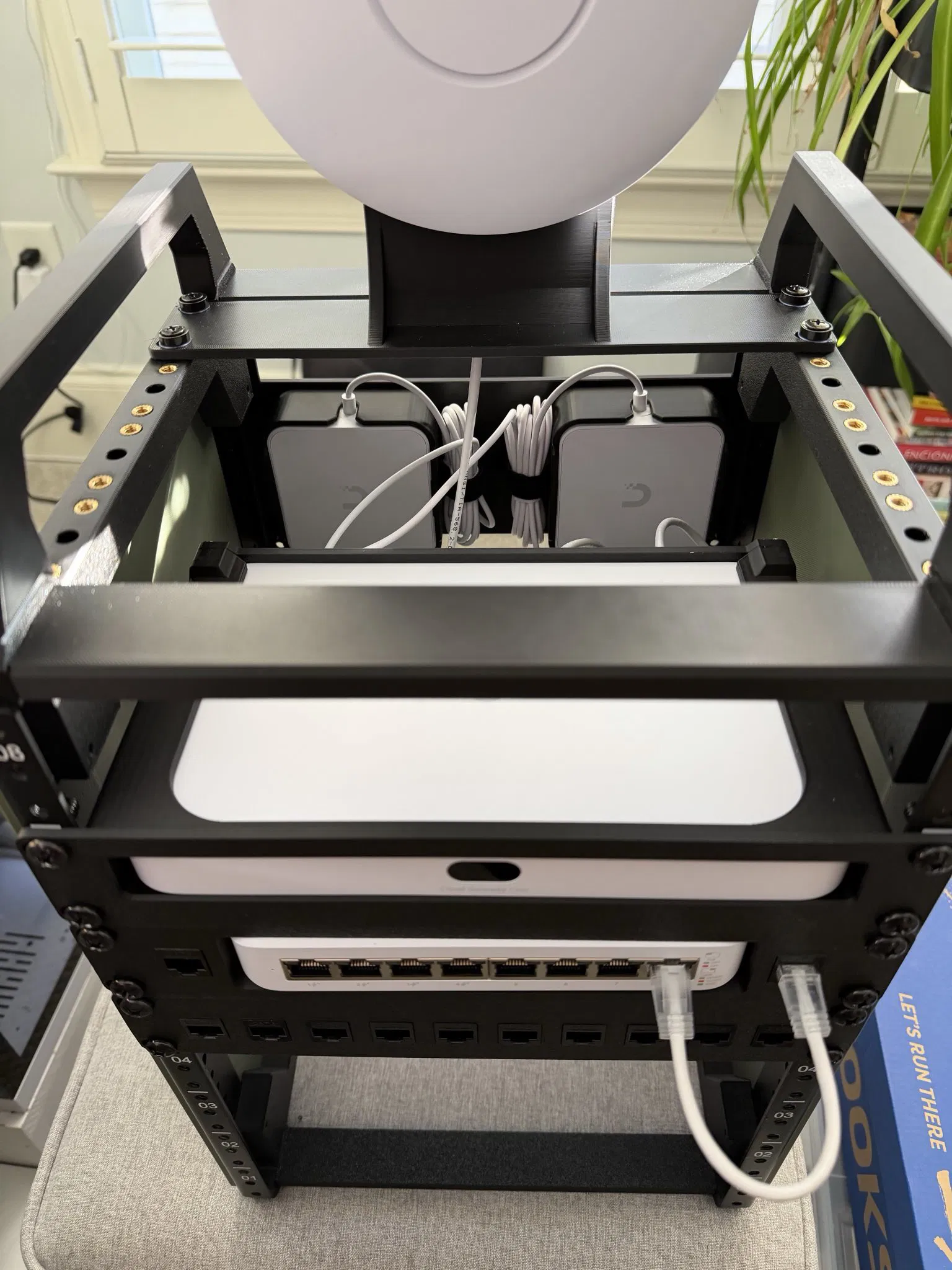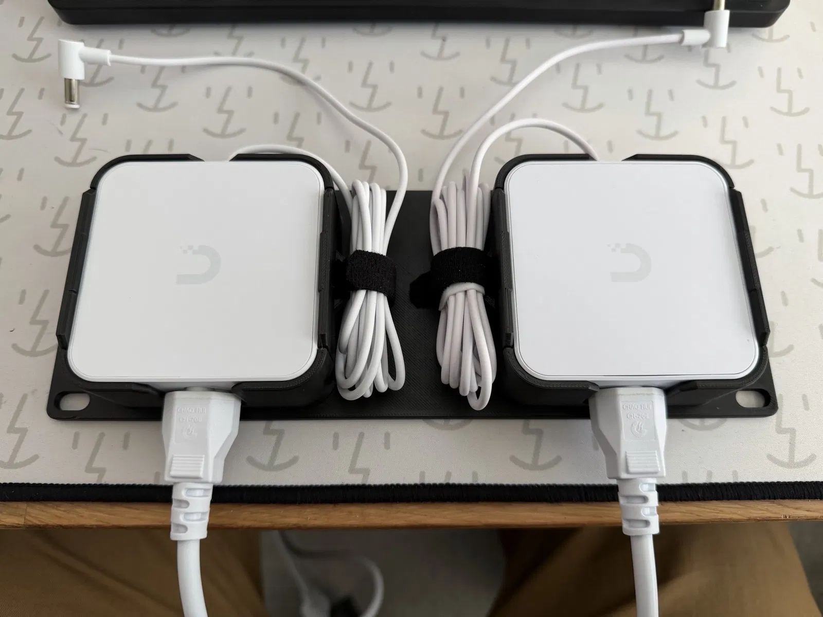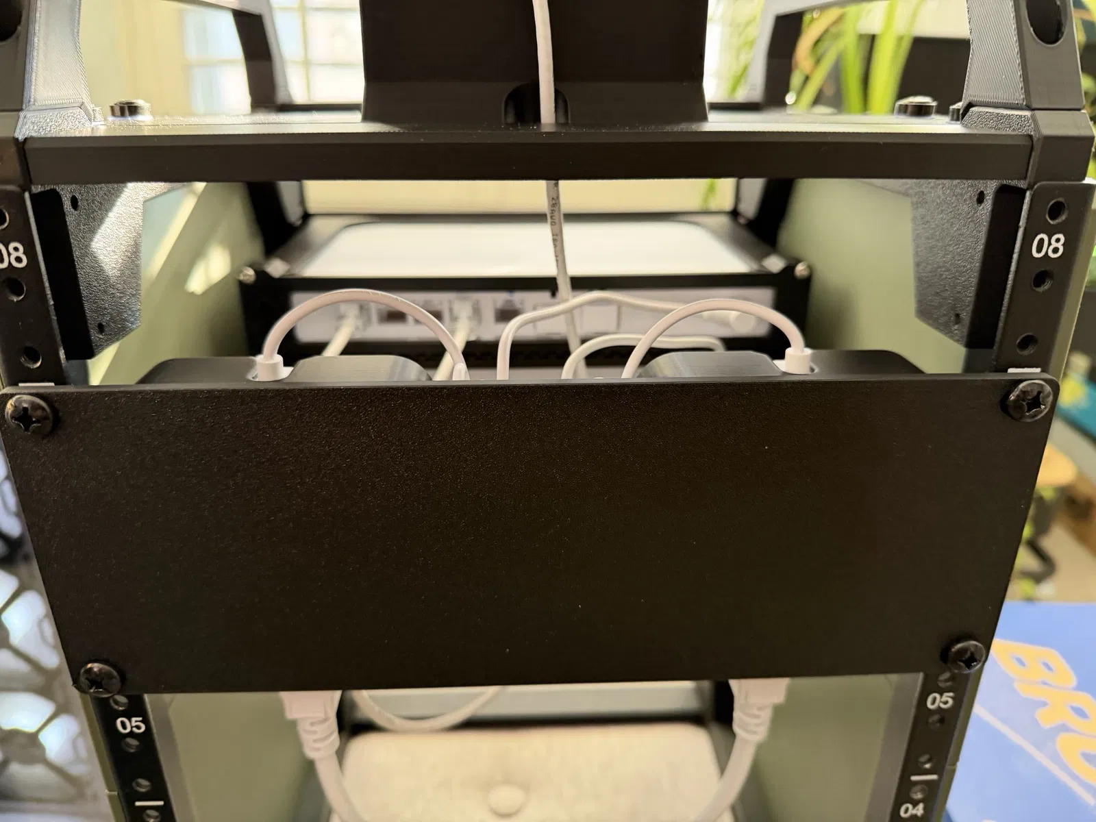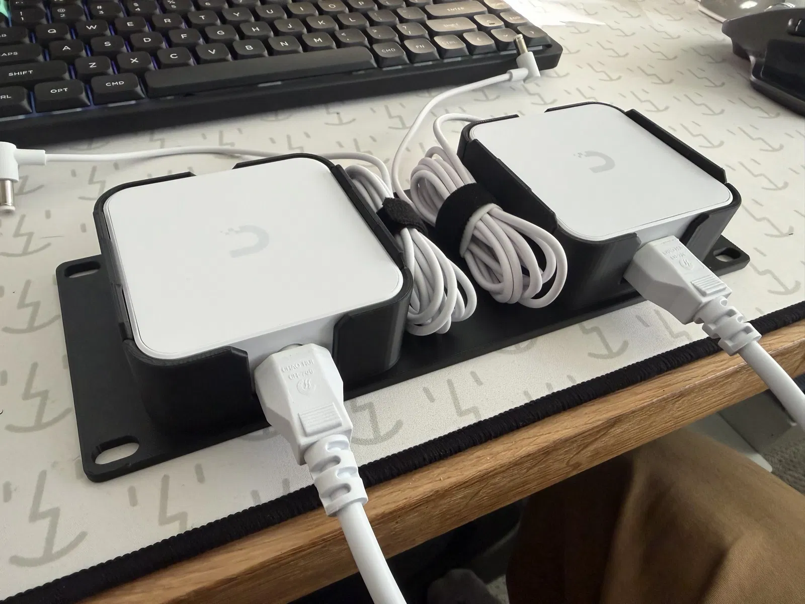 Tấm plate 2U để giữ 2 cục nguồn (power brick) Unifi. Dùng được với power brick của UCG Fiber và Lite 9 PoE, cũng như các power brick khác cỡ khoảng 75mm x 75mm. Mình thấy 2 cục mình có kích thước hơi khác nhau nên đã chừa đủ tolerance để dùng cho cả hai. Mình cũng thêm các tab để quản lý cáp (cable management) giúp mọi thứ gọn gàng.