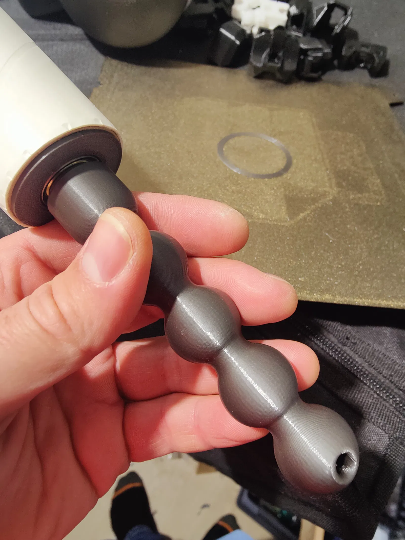 Sau khi in xong, khoan bỏ lớp sacrificial layer hoặc cắt bằng kìm/cutter. Việc này chỉ cần cho phần head. Các phần khác in dễ với bất kỳ thiết lập nào, chỉ cần đảm bảo bạn đã calibrate flow chuẩn để vòng bi lắp khít.