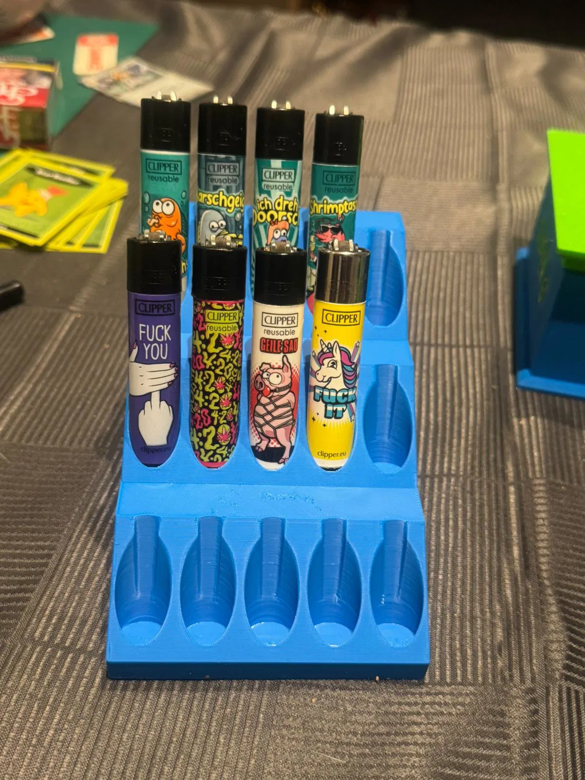 Mẫu kệ trưng bày bật lửa Clipper (Text Remix) với thiết kế đặt nghiêng nhẹ để nhìn rõ và đẹp hơn. Có nhiều phiên bản cho 1–10 và 15 bật lửa, in tốt với PLA hoặc PETG.