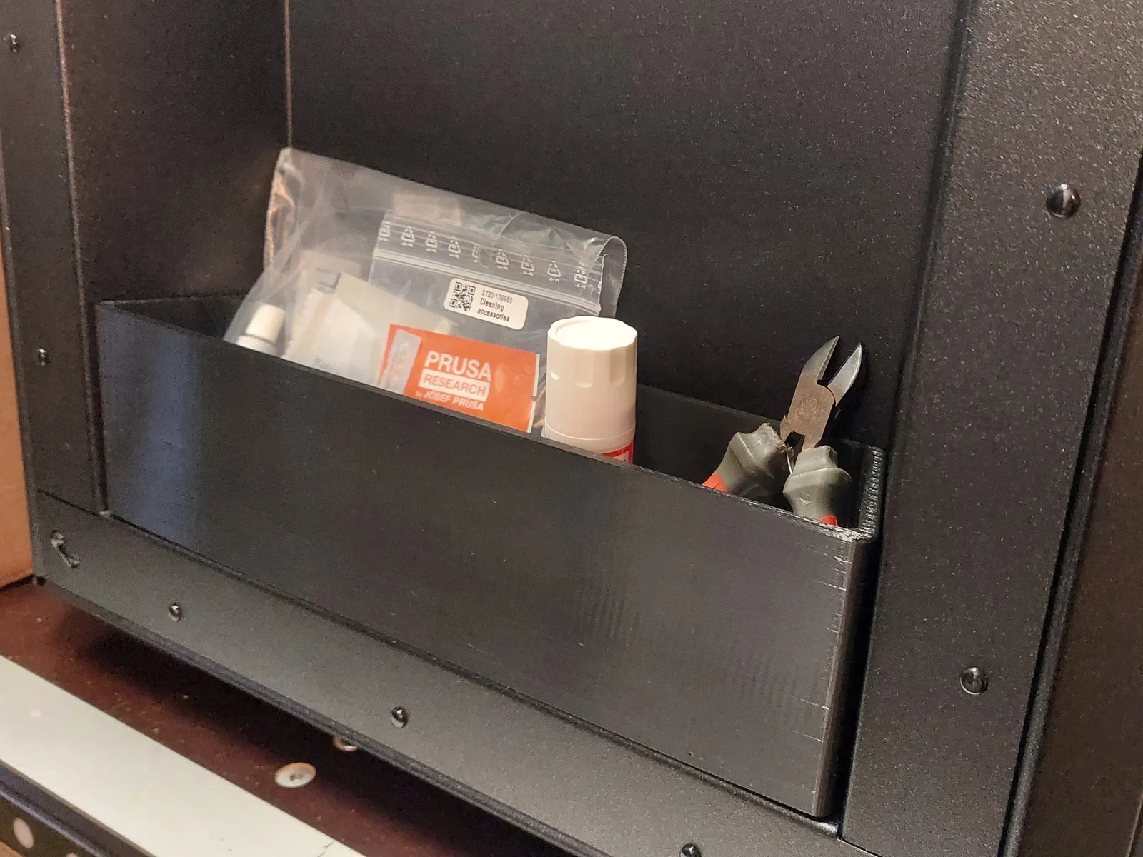 Khay này vừa khít vào hốc ở bên trái của máy in Prusa Core One. Nó giúp bạn tận dụng và sắp xếp gọn gàng phần không gian trống này.